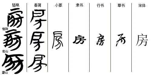“房”fáng,形声字,从户方声,‘房’字目前最早见于战国时期的包山楚墓竹简。户,与住家有关;方,人的周围。造字本义:住人的地方,泛指居室。
