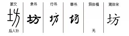 “坊”fáng fāng,形声字,从土方声,fáng音、义同‘防’,作fáng时最早见于西汉的《礼记·郊特牲》、《礼记·坊记》,但《说文》并未收录‘坊’字;作fāng时最早见于唐代《唐韵》。春秋时期将‘坊’字重新定义,音fāng。从春秋战国至唐代,我国城市居民区都采用‘里坊制’,‘坊’与‘坊’之间有墙相隔,坊墙中央设有门,称为坊门。土,与城邑有关;方,人的周围,此处引用‘多个地方’的引申义。造字本义:城内划分的多个区域,如坊隅(街巷,街坊)、街坊、坊巷、坊子等;又引申为‘较小规模的工作场所’,如磨坊、作坊、染坊、酒坊等。由‘坊门’演变成‘纪念表彰人物或事件的建筑物’,如贞洁坊、忠孝坊、牌坊等。