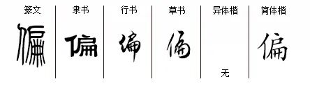 “偏”piān,形声字,从亻扁声,‘偏’字目前最早见于《说文》小篆,但根据文献应不晚于战国末期。亻,与人有关;扁,在户门上题字的木、石板,此处引用‘远远看上去宽而薄’的引申义。造字本义:远远看上去略扁的人,引申为‘不是中心地带的’,如偏远、偏僻等;也引申为‘倾向于某一面的’,如偏不、偏离等。