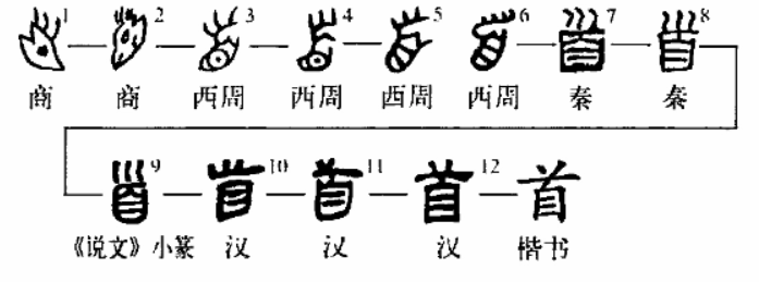 “首”,本义是人头。从甲骨文、金文的字形看,最初并非仅指人头,当泛指一切动物的头。是用高度概括的手法描绘出包括人在内的动物头部最突出的眼睛须发和面部轮廓。《说文》称:“百头也,象形”。“隶书(汉《曹全碑》)将须发省为两点,用直笔方者代替了篆书的弧笔圆折,使“首”从象形字中脱离出来。