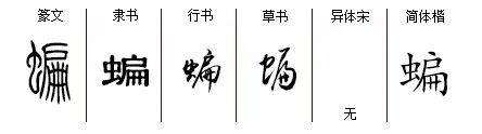 “蝙”biān,形声字,从虫扁声,‘蝙’字目前最早见于《说文》小篆。虫,昆虫、蛇类,引申为‘造字者认为的除禽鸟以外的小动物’;扁,在户门上题字的木、石板,此处引用‘宽而薄的物体’的引申义。造字本义:一种‘翅膀’宽而薄的小动物,特指蝙蝠。