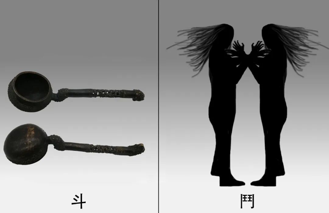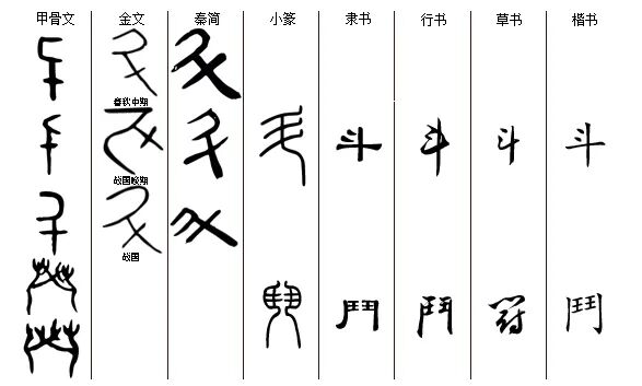 “斗”dǒu dòu,‘鬥’的简体字,但‘斗’和‘鬥’本是两个字,皆为象形字,‘斗’和‘鬥’字最早见于殷商甲骨文。甲骨文的‘斗’字,读作dǒu,是一种口大底小的方形或鼓形的带柄量器,多用木头或竹子制成。金文与甲骨文字形变化不大,《说文》小篆略有变体,楷书将容器简省为两点。造字本义:口大底小的带柄量器,十升等于一斗,十斗等于一石。引申为‘形如斗状的器物’,如烟斗、漏斗等;也因‘斗’的形状引申为北斗七星;又由‘斗’作参照物来形容事物的大小,大于‘斗’的事物为‘小’,如斗船(小船)等;小于‘斗’的事物为‘大’,如斗碗(大碗)、斗目(睁大眼睛)等。