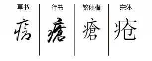 “疮”chuāng,形声字,‘瘡’的简体字,从疒nè倉声,‘瘡’字目前最早见于南朝类书《玉篇》。疒,与疾病有关;仓,本义是储物建筑,此处借仓库之形,两形会意,指形似‘仓库’的疾病,如脓肿、溃疡、疹子等。造字本义:形似‘仓库’的疾病,如疮疹、疮毒等;引申为‘痛苦、伤痛’,如疮疥之疾(比喻轻微的祸患;比喻痛苦的经历)、疮痛(疮口或伤口痛;疮伤病痛)、疮痍等。