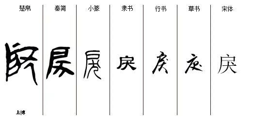 “戾”lì,会意字,从户从犬,‘戾’字目前最早见于战国时期的上博楚简。秦简与《说文》小篆的‘戾’字结构相同,皆从户从犬。户,单扇门,此处引用‘住家’的引申义;犬,象形字,与狗有关。两形会意,描述了看家狗的三种心理状态:其一,主人离家后的悲伤、思念;其二,见到生人、流浪狗经过的嚣张、亢奋;其三,看家狗看到主人归来后由悲转喜的心理变化。造字本义:看家狗,由此引申为‘悲伤;嚣张;转换’,其中‘悲伤’义由后造字‘悷’继承;‘转换’义由后造字‘睙’继承。
