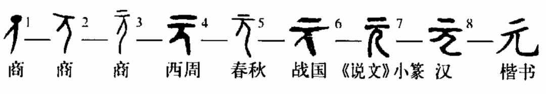 “元”的甲骨文写作图2、3,表示人的头部的圆实点虚化为一横,西周金文就甲骨文之形写成图4。“元”字的这种字形演变,与“天”字是一致的。至于后来,再在上加一横,特指其头部之所在,便是甲骨文、金文常见的各种“元”形了。再加一横之后的便成了“元”的基本结构,一直沿用至今,隶变时只是将侧立的人形变成“儿”而已。未加一横的字形隶变后就成“兀”,与“元”分立为二字。