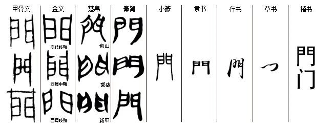 “门”mén,象形字,‘門’的简体字,‘門’字最早见于殷商甲骨文。甲骨文的‘門’字由两个单扇木板或在两扇木板上加一横木构成。西周金文、楚文字、秦简、《说文》小篆均沿袭殷商甲骨文。简化字‘门’来源于草书。东晋以后,王羲之、王献之、颜真卿等许多书法家的草书,都将‘門’写成‘门’的形体。于是,草书楷化便发展为唐以后的简化字‘门’。造字本义:双扇木板,与作内门的户相对。门是人出入房屋的必经之处,又引申为‘途径’,如门径、窍门等;门通常建于居家的房屋中,由此引申为‘家、家族’,如门第、家门等;又引申为‘不同的派别、类别,特指宗教、学术方面不同的集团、派’别,如门派、佛门等;也作量词,如一门功课、一门炮等。