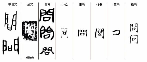 “问”wèn,会意字,‘問’的简体字,从門从口 ,‘問’最早见于殷商甲骨文。战国晚期、秦简、东汉《说文》小篆皆沿袭商朝甲骨文。暂未发现西周、春秋、楚国的版本。門,与门有关;口,与嘴有关,此处引用‘说话、沟通’的引申义。造字本义:隔着门沟通,引申为‘不熟’,如责问、过问、审问等;后引申为‘一般意义上的问询’。