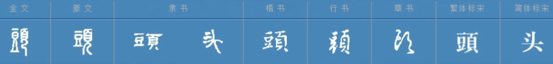 “头”,“頭”的简体字原为形声字,从页,从豆,豆亦声。根据到目前为止的考古发现,繁体字头字最早出现于春秋蔡国铜器上,习见于战国文献,而“首”字则产生于商代甲骨文中。简化字头字最早见于居延汉简,是繁体字的草书楷化,但典籍中很少见。头当是“首”字的音变,或是因语音差异(或因方音、或因历史音变)而制造的形声字,其义与“首”字完全相同。本义为脑袋,指人身体的最上部分或动物身体的最前的部分。“头”的本字是“页”字。“页”字上部像个头,头上有大眼睛,头顶有头发,头下是半跪着的一个人身。金文虽然不太像了,但仍然看出上部是头,下部是臂、身、腿。小篆上部是头,下部变得不像人形了。隶书、楷书笔画化。通用的是简化字“页”。“页”字的本义就是头。汉字中由“页”组成的字大都与“头”有关。