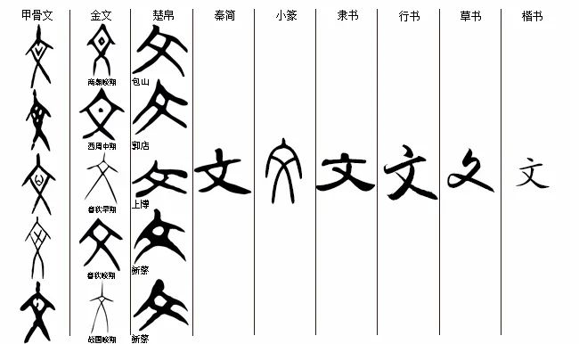 “文”wén,象形字,‘文’字目前最早见于商代甲骨文。甲骨文的‘文’字外廓为鱼的象形,内里为鱼鳞的简省,两形会意即指鱼鳞(鱼表面的纹理)。商晚期至西周晚期的金文与甲骨文的字形基本一致,偶有去掉内里鳞片的个别情况;春秋早期至战国晚期大多都去掉内里鳞片。楚简、秦简、东汉《说文》小篆承袭春秋至战国时期的金文,与现在看到的‘文’无异。造字本义:鱼的鳞,引申为‘物体表面的纹理’,如文身、天文等;古文字由刀刻在不同的载体上,又引申为‘文字’,如甲骨文、石鼓文等。