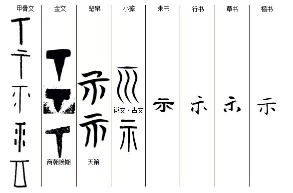 “示”shì,象形指事字,作左旁时写作‘礻,‘示’字最早见于商朝甲骨文。据考证,这是古代的‘神主’,即供奉祖先、神灵的木牌或石头祭台。甲骨文的‘示’有多款:‘不规则点的示’,在神主前祭祀时常要洒酒或祭牲于神主之上,用不对称的饰笔表义洒酒或血滴;‘对称点的示’用对称的饰笔表义庄重,一般用作祭名;‘不带点的示’即指神主或祭台。上面的短横表示祭品或牌位,下面的一竖表示支撑石桌的脚。晚商金文的‘示’下面的一竖变成了像‘小’字一样的支架,这似乎使石台能摆放得更平稳些,也可能是表现祭祀时涂抹在神主上的血液或酒。从其他‘示’旁字可知,西周早期至春秋晚期金文的‘示’与现今版本基本一致,稍有区别的是上部是或有或无的‘短横’,但史料未载。战国楚简、东汉《说文》小篆承袭金文字形,没有太大变化。造字本义:祭天敬祖、求神问卜的祭台,引申为‘神祖的泛称’;商人祭祀活动都在上午进行,由此引申为‘显示、展示’;祭祀祖先时常常会说些祷告祈求的话,由此引申为‘有事相告’。