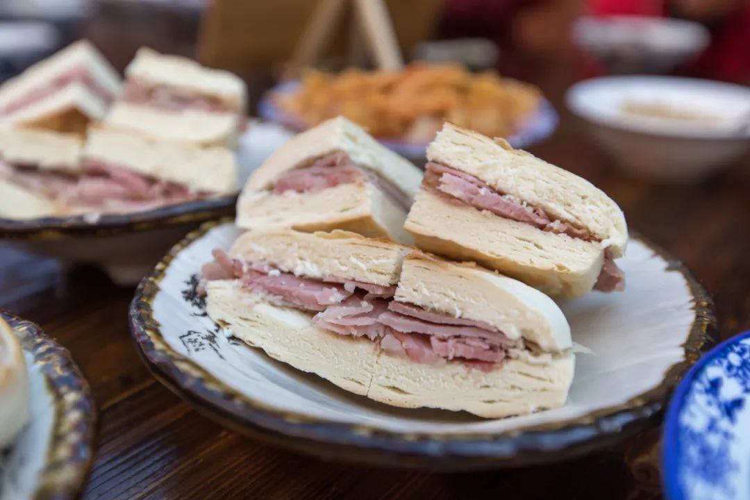 ▲ 上图:陇西腊肉与火腿,图/图虫·创意;下图,馍馍夹陇西腊肉,摄影/刘运泽