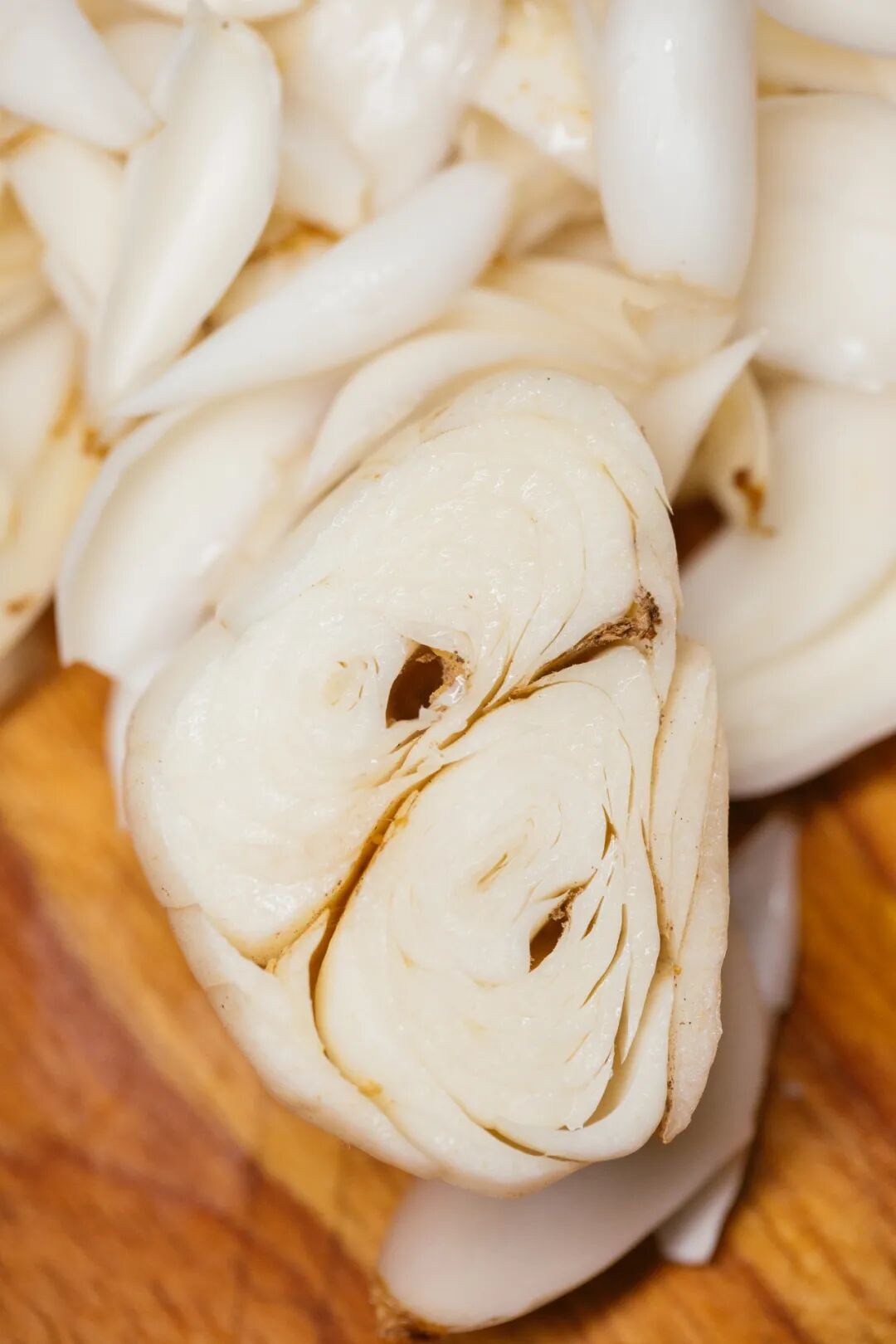 橙红花朵地下的鳞茎,是可作为蔬菜食用的部分。它通体洁白,由许多白色的鳞状叶片(鳞片)一片片地层层相围、重叠抱合而成,既紧实又圆润,瓣尖带着若有若无的淡紫色,仿佛具像化了“圆满”二字——也许,这便是“百合”这个名字的由来吧。