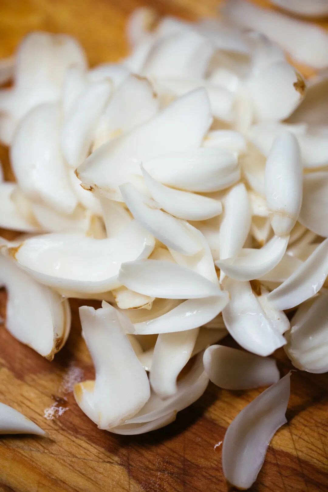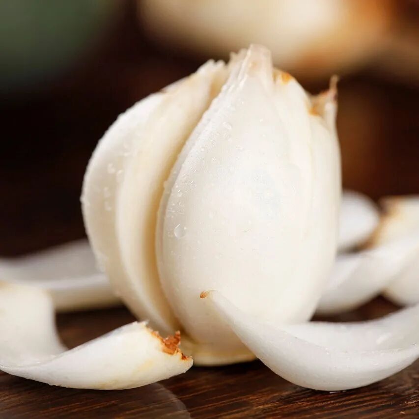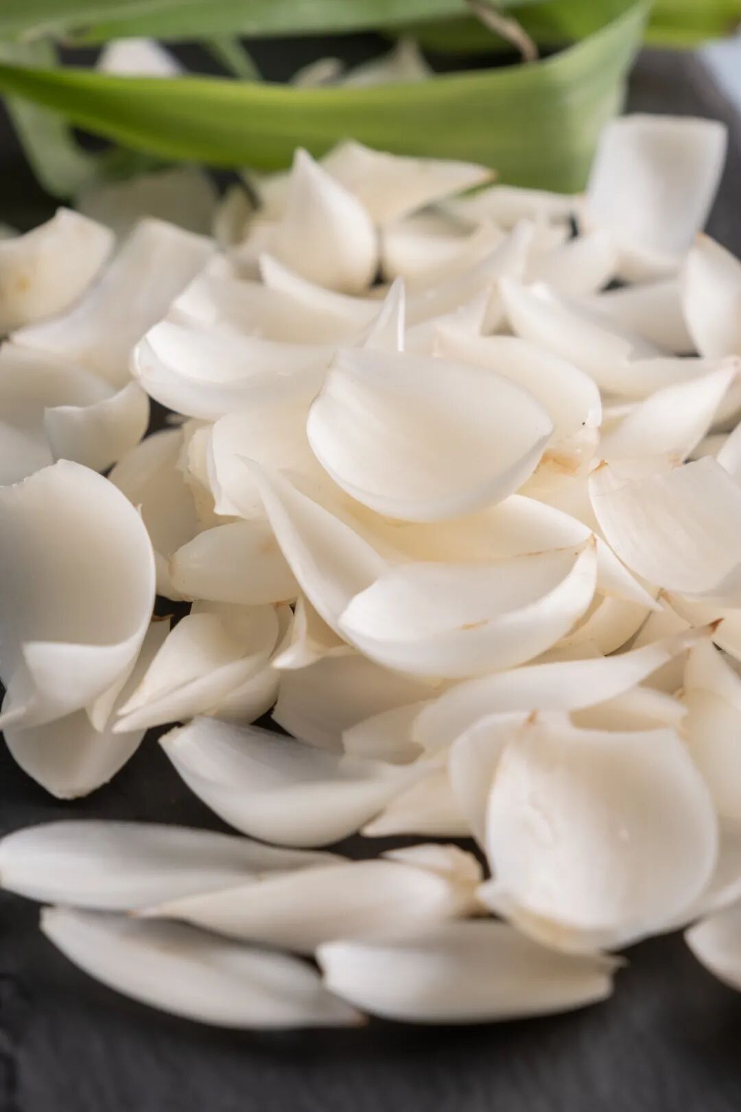 从地里挖出的新鲜百合,擦去泥土,剪切掉那些已干枯发黄的鳞片尖,通体白洁晶莹,如玉般圆润柔和。逐层地轻轻掰开合抱在一起的鳞片,会发现每一瓣都有一定的厚度,由外至内,每一瓣的弧度越来越明显,质地也越来越娇嫩洁白。