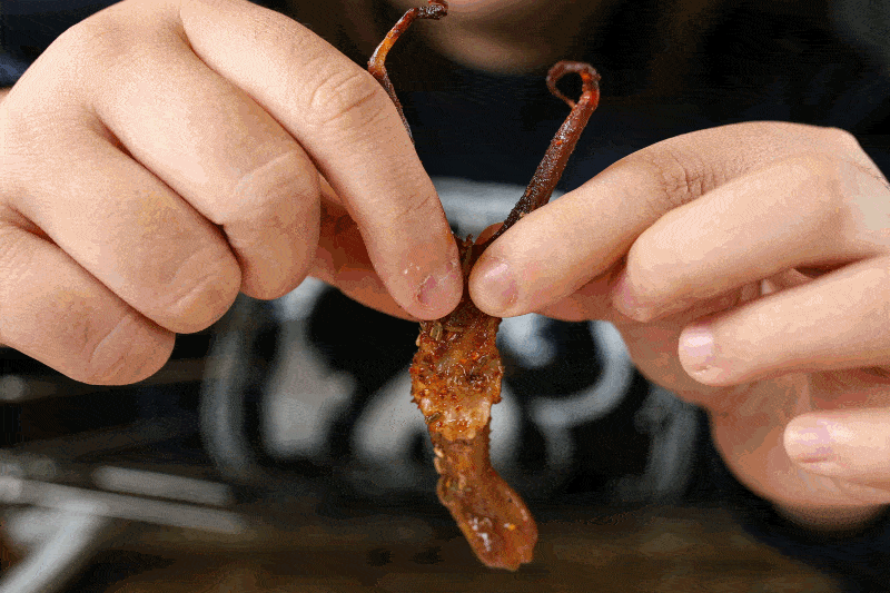 吃鸭舌,又是另一种享受了。细细长长的软肉,似硬非硬的,轻轻挑逗你的舌尖;你嚼着嚼着,唇齿与脆骨激烈碰撞,让你舌根生津,湿漉漉的停不下来;最后的两根叉骨,你还要用舌头裹着,一点点嗦完,一丝丝味道都不放过……