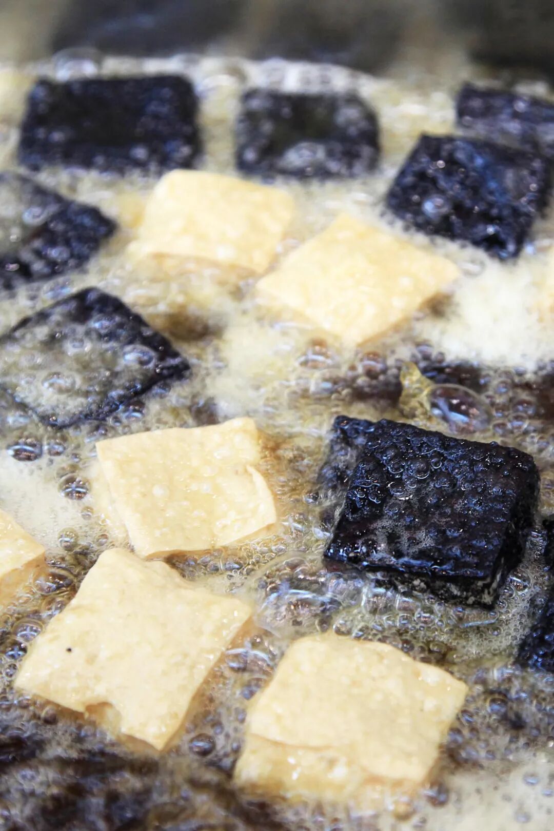 绍兴人也做油炸臭豆腐,讲究“现臭现做”。豆腐切成长条小块,再放入宁绍地区常见的苋菜梗臭卤中提味,置入热油锅中,炸到外表金黄即可。它们臭得惊人,在餐桌上却红得发紫。