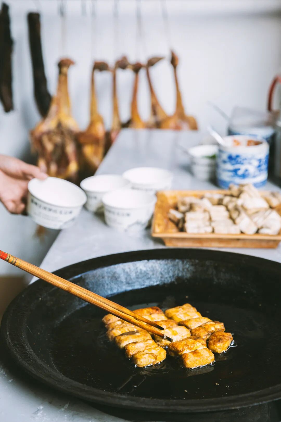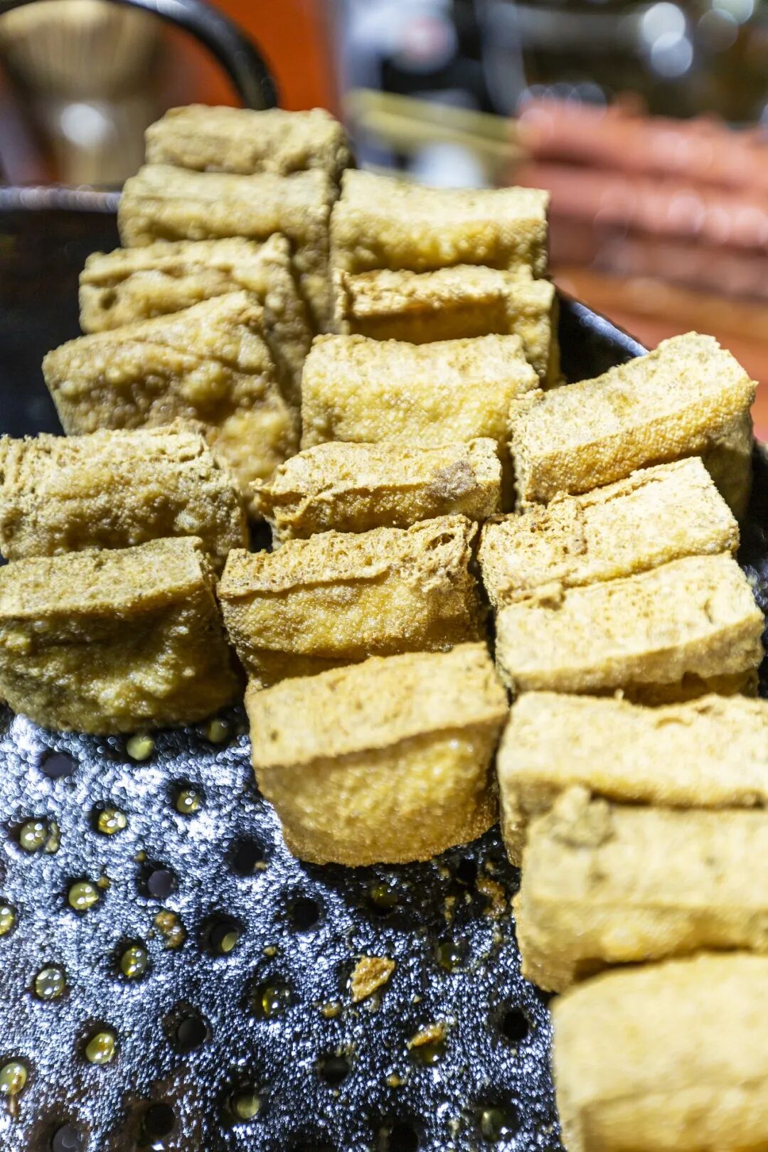 但它们的命运都将归于一口油锅。嫩豆腐炸至金黄,口感才恰到好处,臭豆腐干要炸透,然后串在竹签上售卖,如同一串串冰糖葫芦。