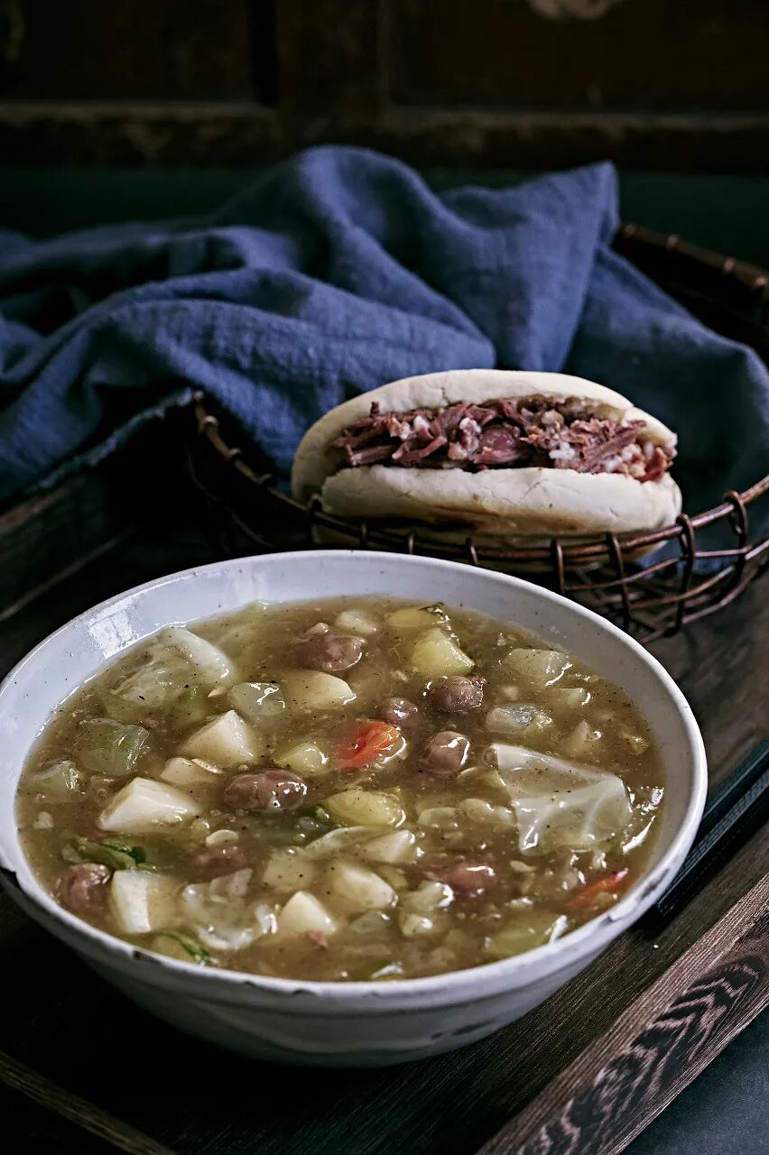 肉,是腊汁肉。腊汁肉的诀窍,就在煮肉的汤里,贾平凹曾在《陕西小吃小食录》里写过,“汤,陈汤,一年两年,三代人四代人,年代愈久味愈醇色愈佳。”