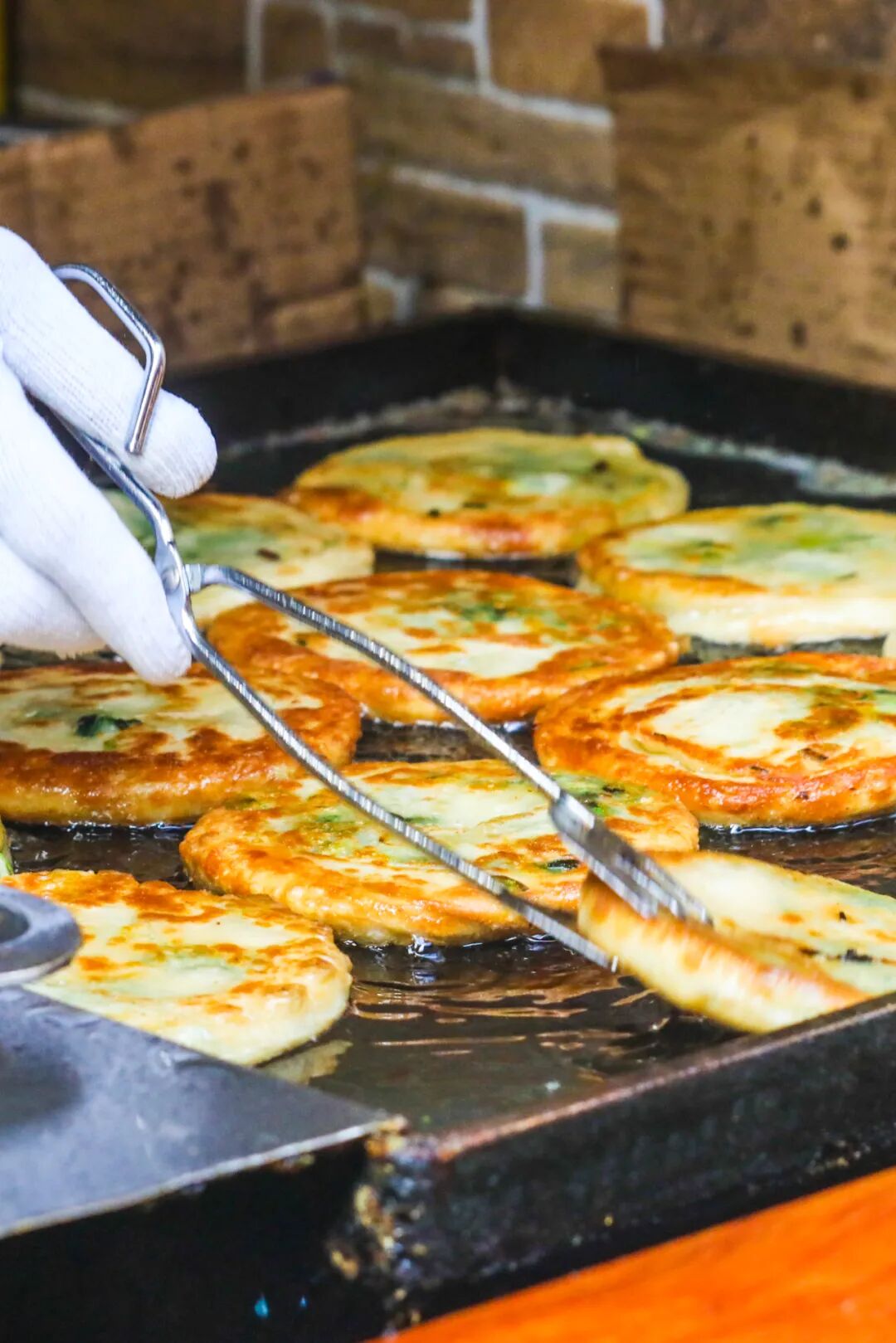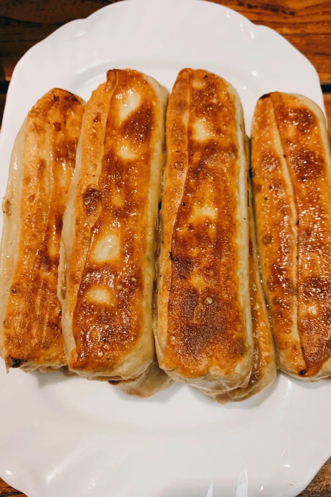 这是一种不走寻常路的火烧。你看它怎么做的:先取一剂面,擀薄薄的,放馅儿,然后开始内卷它,卷成一个方棍子,最后把两边多出来的面一搭,原本散漫的馅儿就被紧实地包裹起来。放油锅里一煎,等到两面金黄,出锅。
