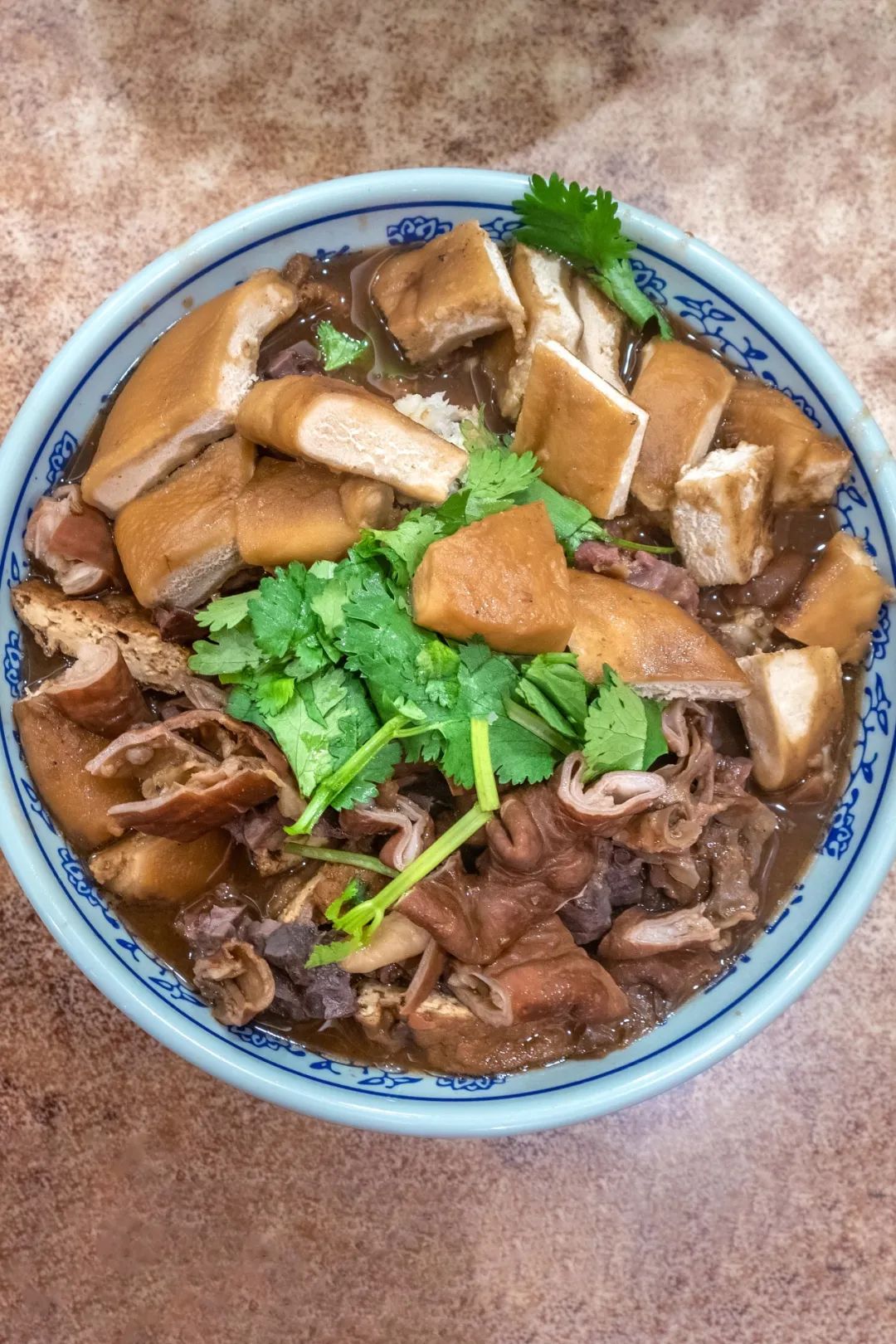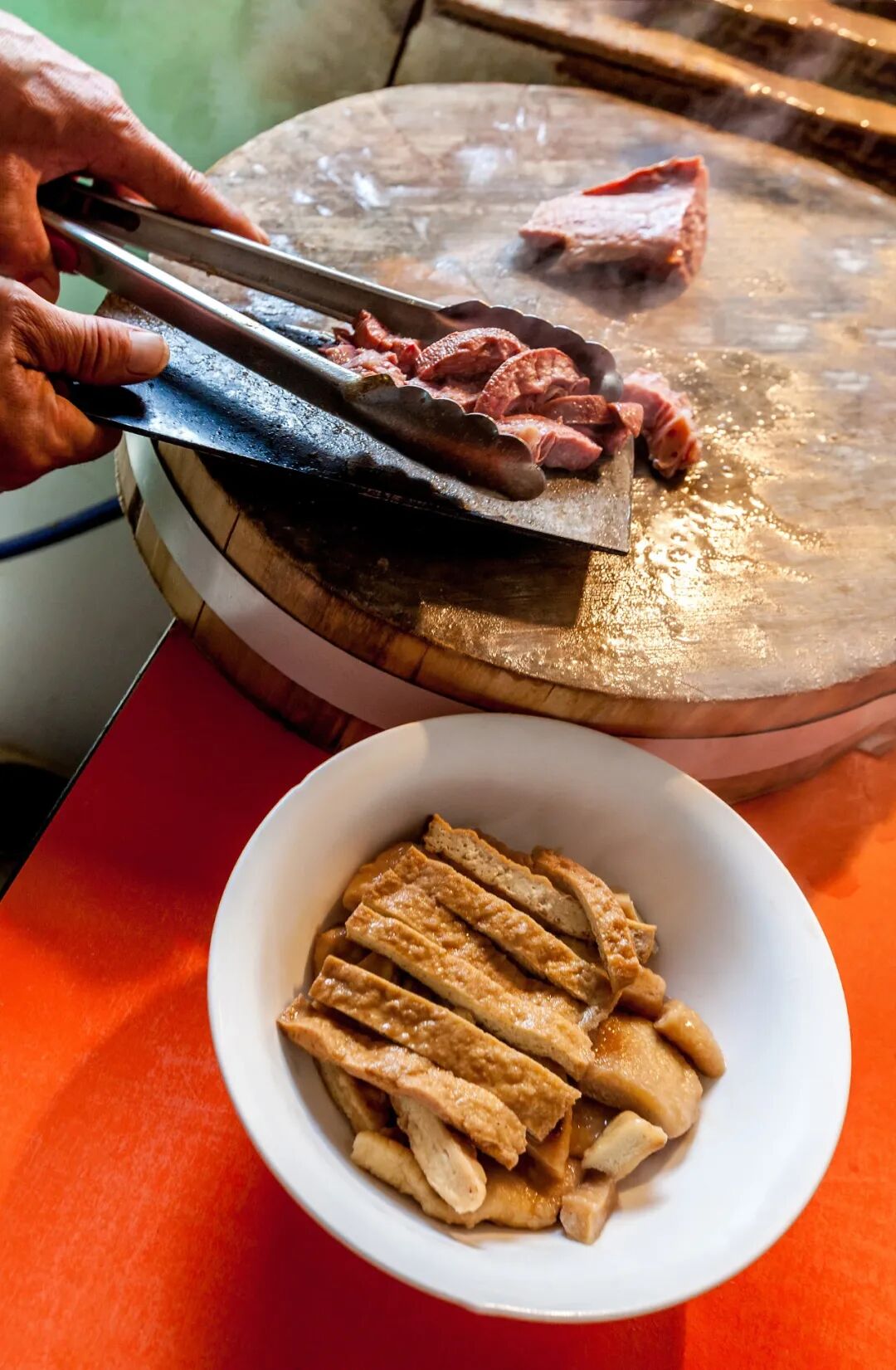 点上一碗,老板夹出一个火烧,正切几刀,斜切几刀,送进碗里垫底。豆干切条,肠、肺剁小块,层层码上去。最后从锅里舀一勺热汤,一浇,再搁点香菜、蒜泥、辣椒油、豆腐乳、韭菜花……绝了!