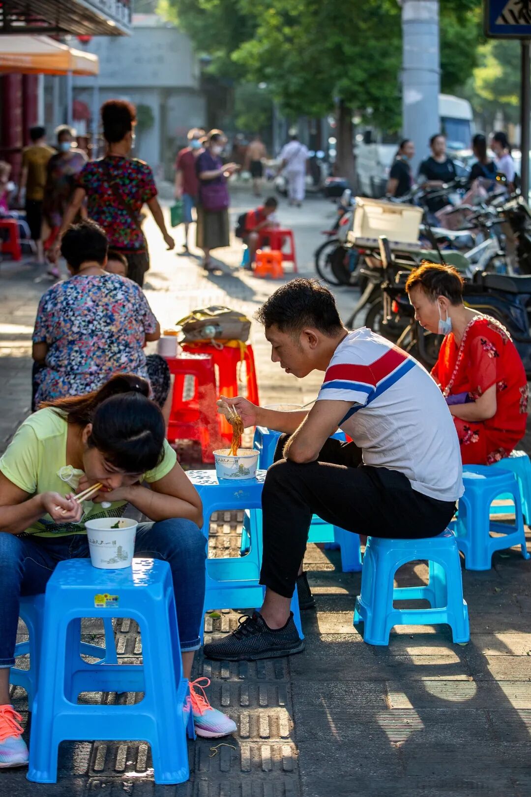 就拿最出圈的武汉来说,一碗颜色金黄、飘着麻酱香气的热干面,有股迷一样的吸引力。在热烘烘的晨光里,芝麻酱与面条融合的香气,调动起了人的无限活力,无论是坐着、站着,还是走着、骑着车,哪里都可以吃上一大口。