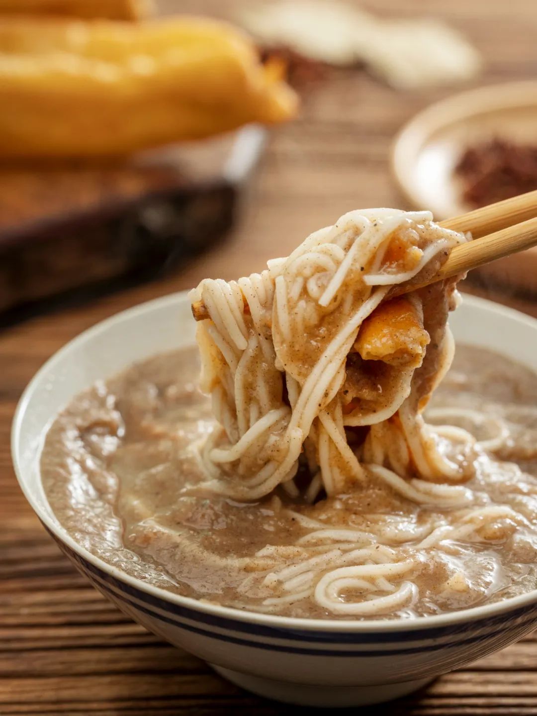 别看糊汤粉卖相一般,却暗藏玄机。一碗汤粉里,不见鱼却满口都是鲜鱼味。新鲜的喜头鱼(鲫鱼)彻夜熬煮,小火煨上,鱼肉脱形、熬化,尽数化入汤中,做糊汤粉比做鱼汤还费劲。