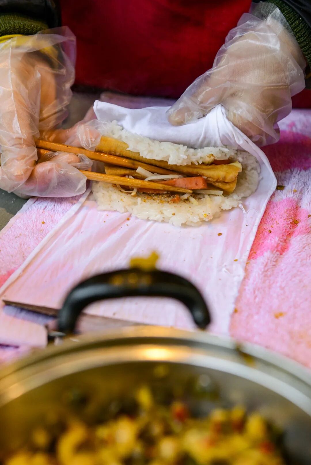 糯米压着薄薄的豆皮,既踏实,又抗饿,还要再加料,肉丁、笋丁、榨菜、香菇,精致了许多。趁着热,心急火燎地吃,才是正经事。