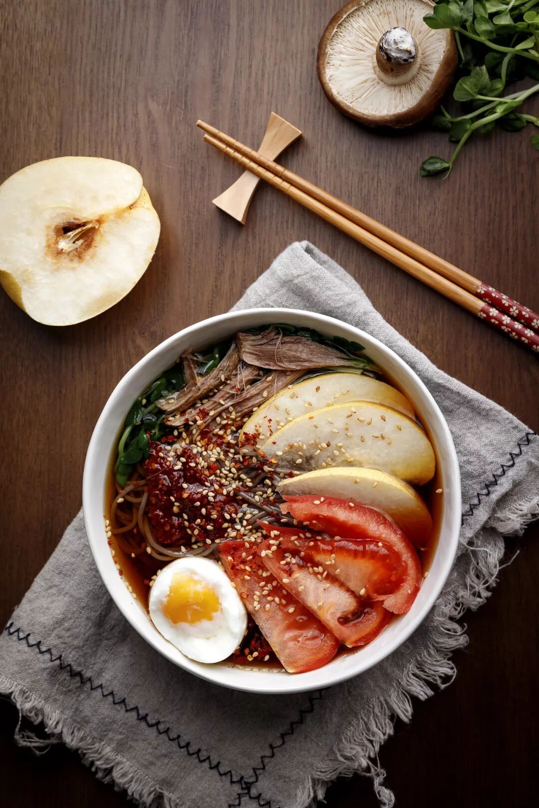 冷面,是朝鲜美食的大宗。区别于南方的凉面,朝鲜冷面,多使用荞麦制作而成,黑黄两色的面条,弹糯顺滑。厚约一厘米的牛肉片、酸甜的苹果片、对半切的鸡蛋装点其间,一碗冷面,愣是有种“满汉全席”的丰富感。