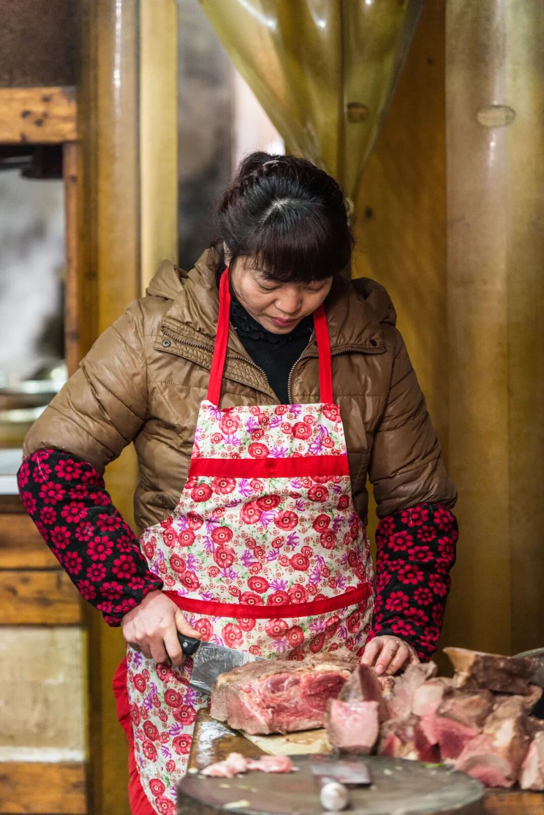 图为店家在熟练地分割牛肉。
