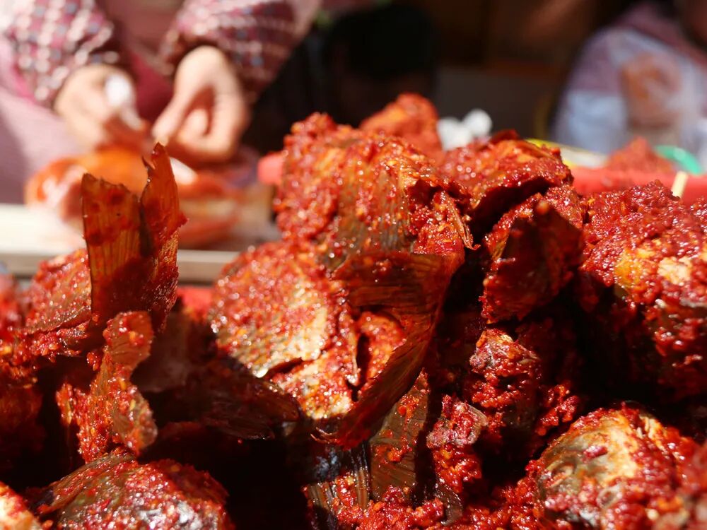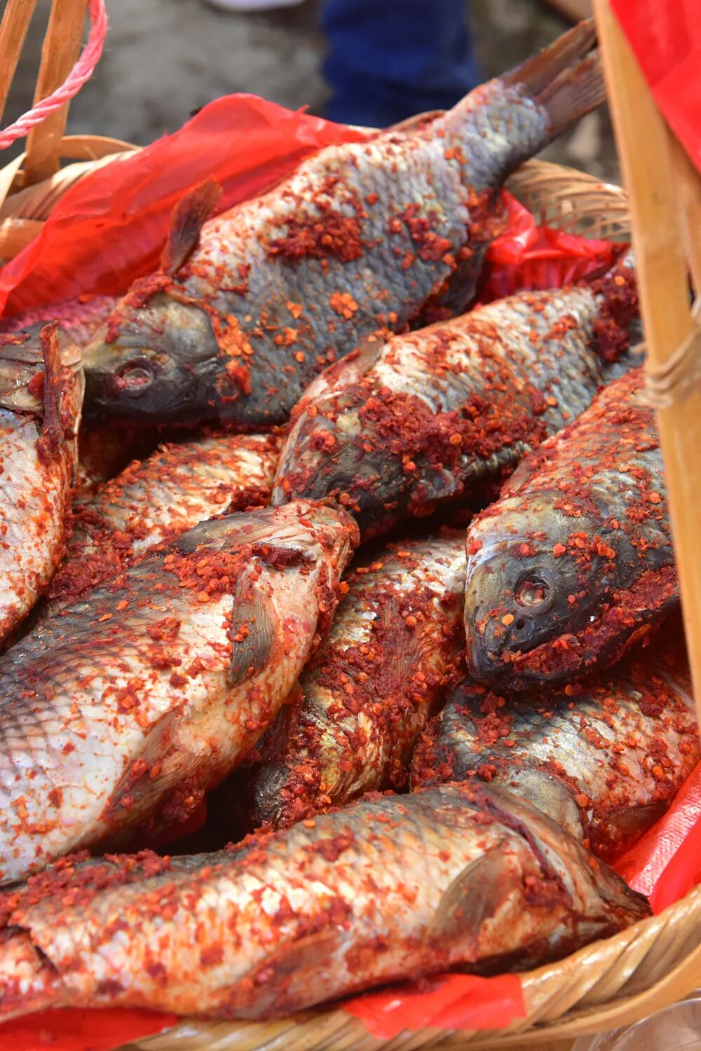 与稻田伴生的鲜鱼,先盐渍、微晾,再腌入由盐水、糯米和辣椒配置而成的酒糟之中,全部塞入木桶,存封数月甚至数年。待到这咸鱼重见天日,便不再是街边的无名小咸鱼,而是集酸辣甜为一体的进阶咸鱼,也叫酸鱼,是侗族人婚俗中的顶尖之礼。