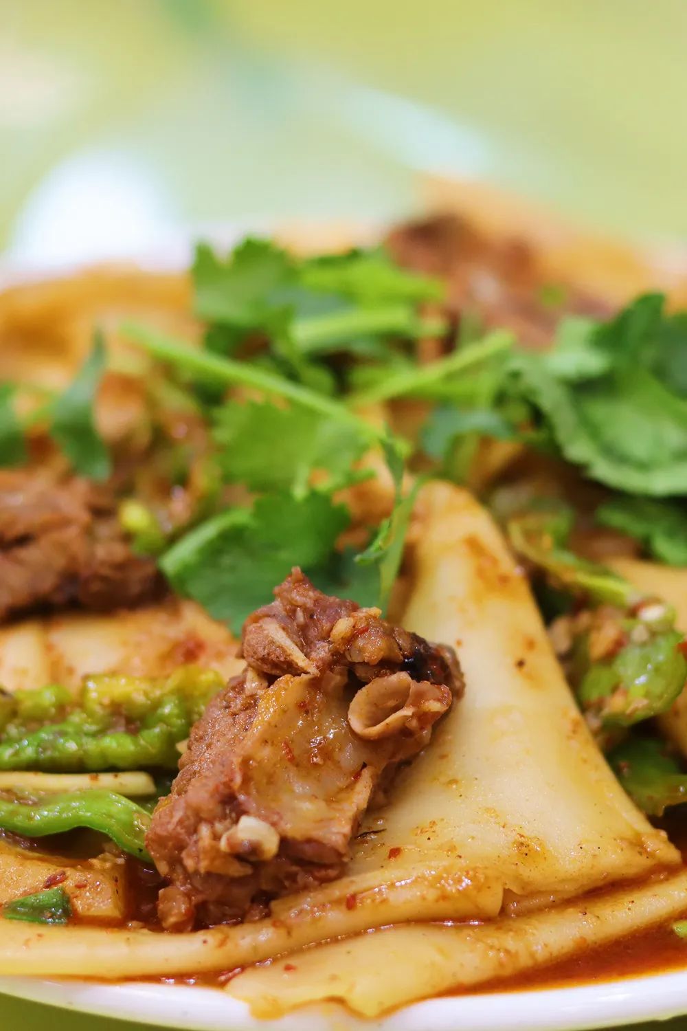 做胡羊焖饼,第一步是做红烧羊排,再加水炖煮,接着将薄圆饼一张接一张放进肉锅,焖个一分钟左右捞出,最后将快要收干的羊肉汤,和一张张面饼下锅放蒜一起烩。出锅时,吸饱肉汁的面饼油津津、黄亮亮,羊肉更被炖得软烂,保证你吃一口,就有飞天的感觉。