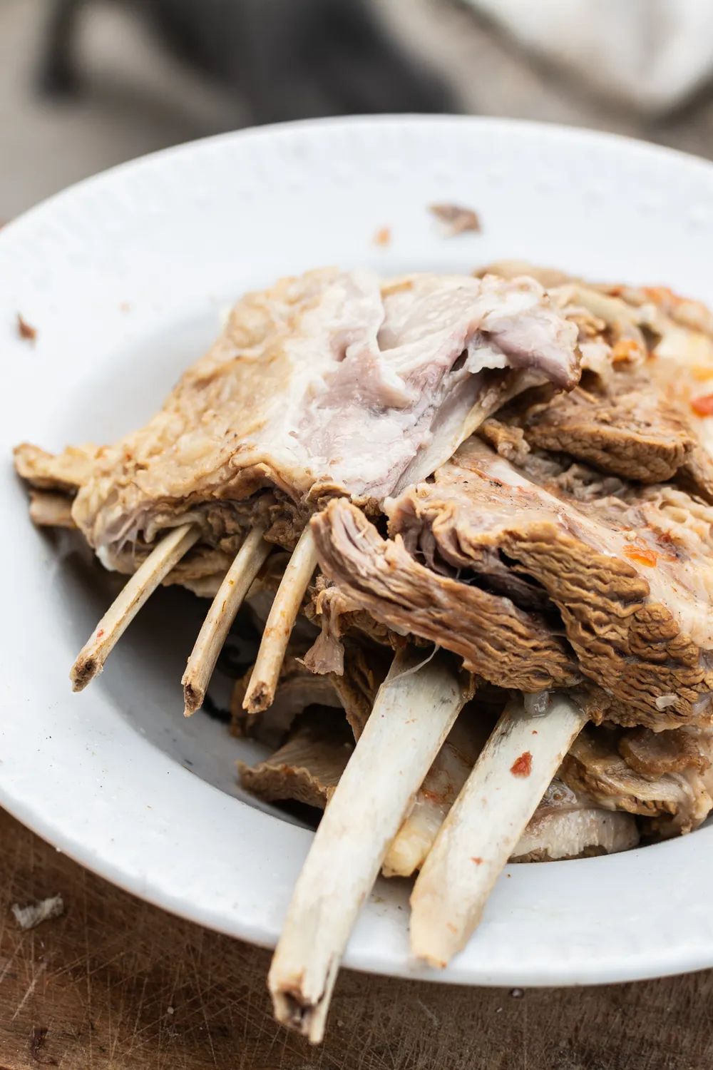 带骨羊肉,各部位在清水中简单煮熟,出锅后肉色清淡,切成条形或块状,就是一盘上好的东乡手抓。