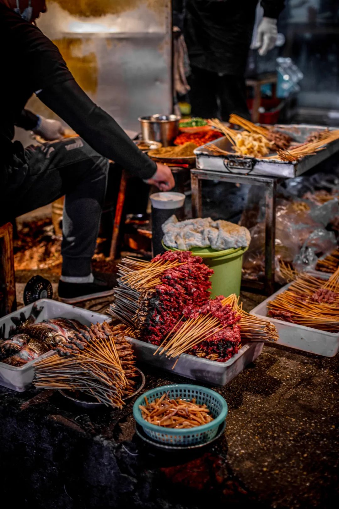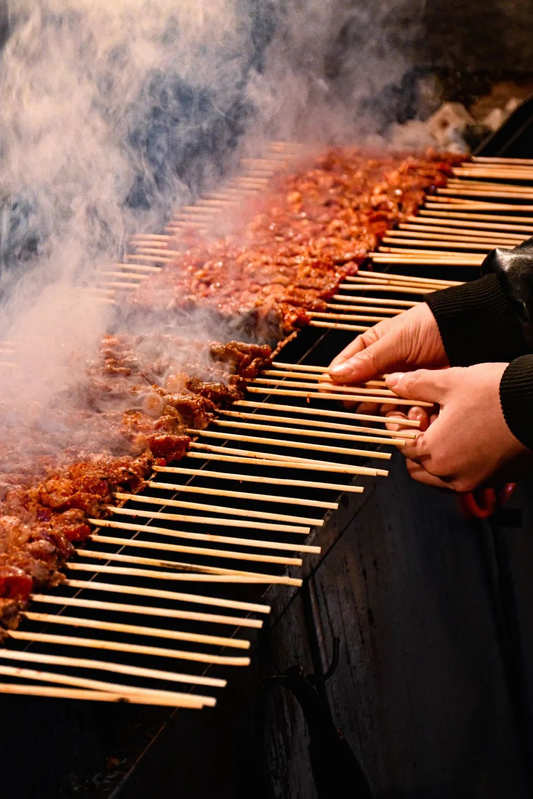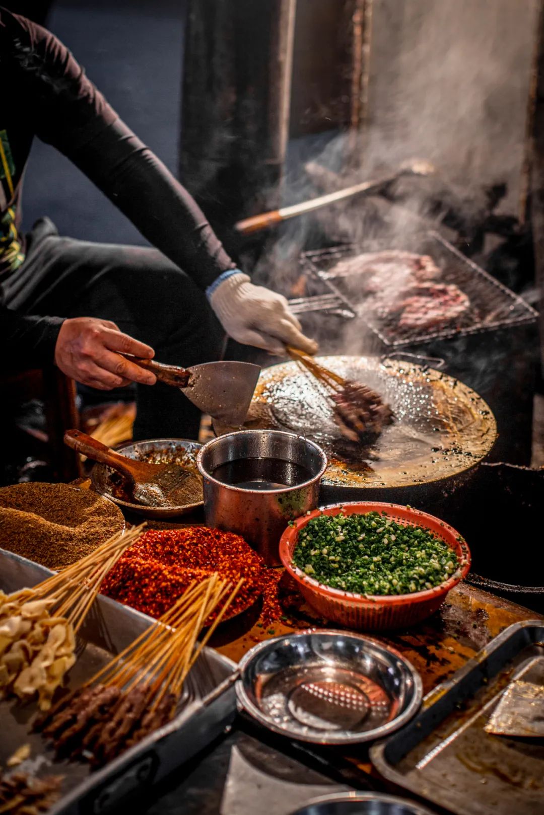 只见烧烤摊前师傅稳如泰山,捻指挥洒,一把把干辣椒粉、孜然粉在空中飘扬,翻面、刷油,一招一式,都是功力。