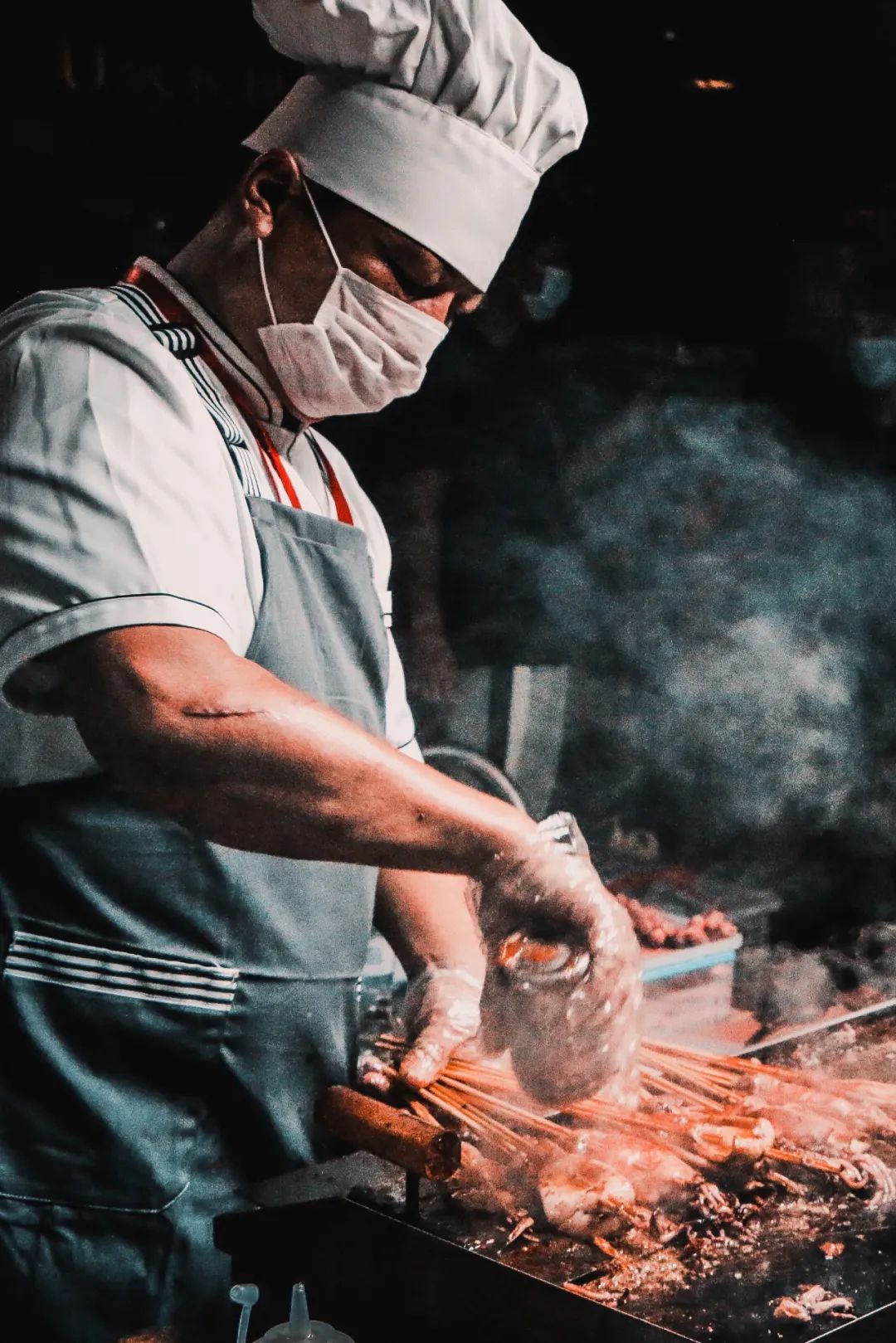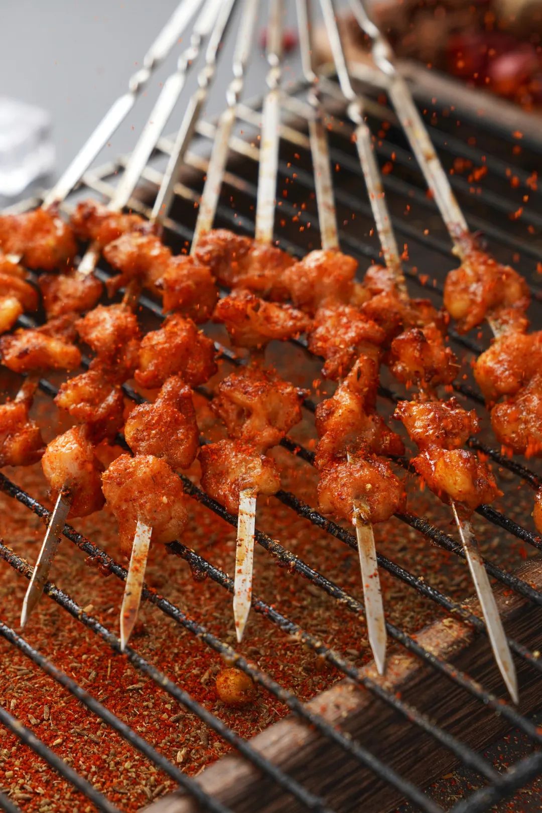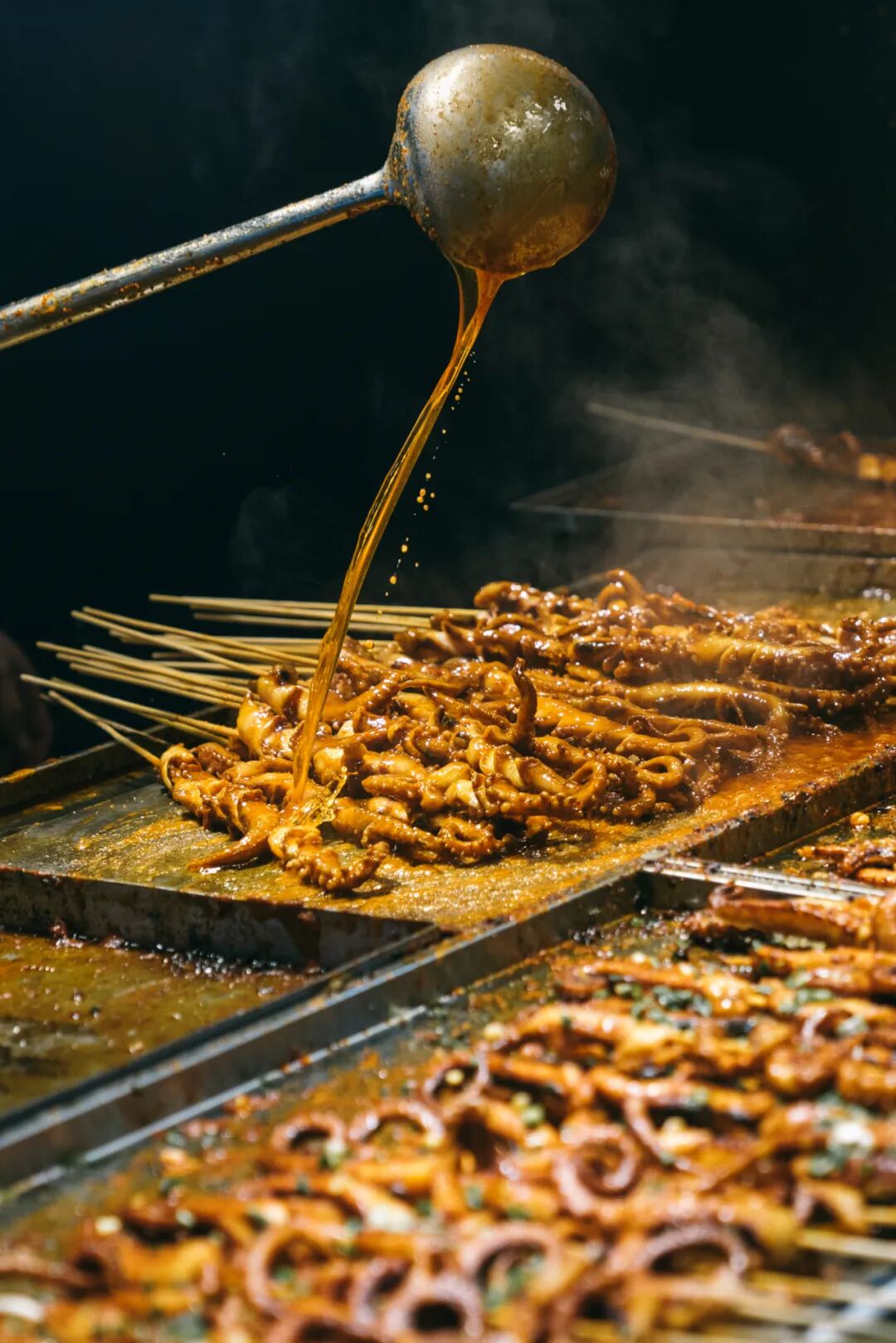 只见烧烤摊前师傅稳如泰山,捻指挥洒,一把把干辣椒粉、孜然粉在空中飘扬,翻面、刷油,一招一式,都是功力。