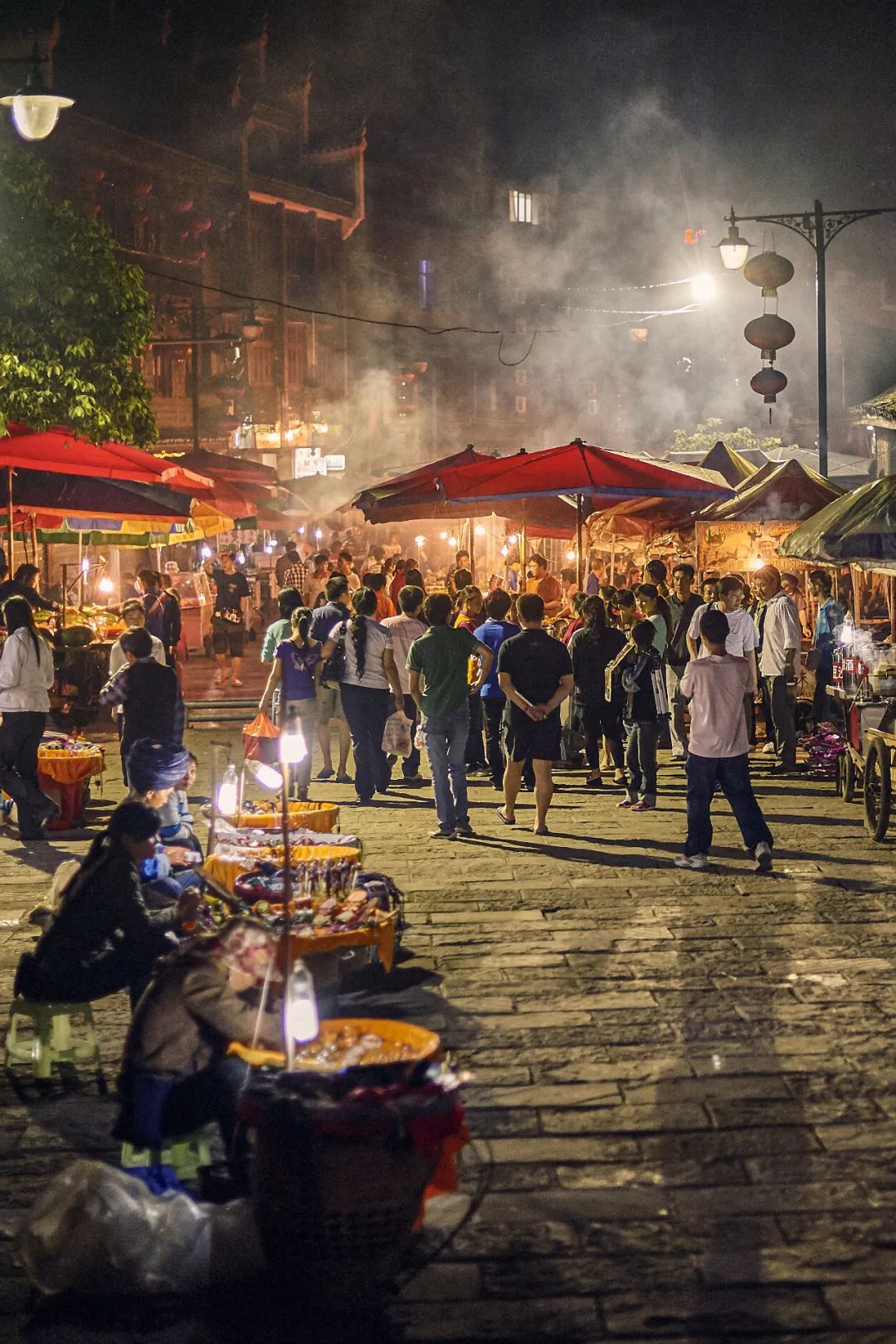 入夜时分,河畔老街青烟冒起,铁板上滋滋作响,酸辣鲜香都融化在沿河搭起的棚子里。