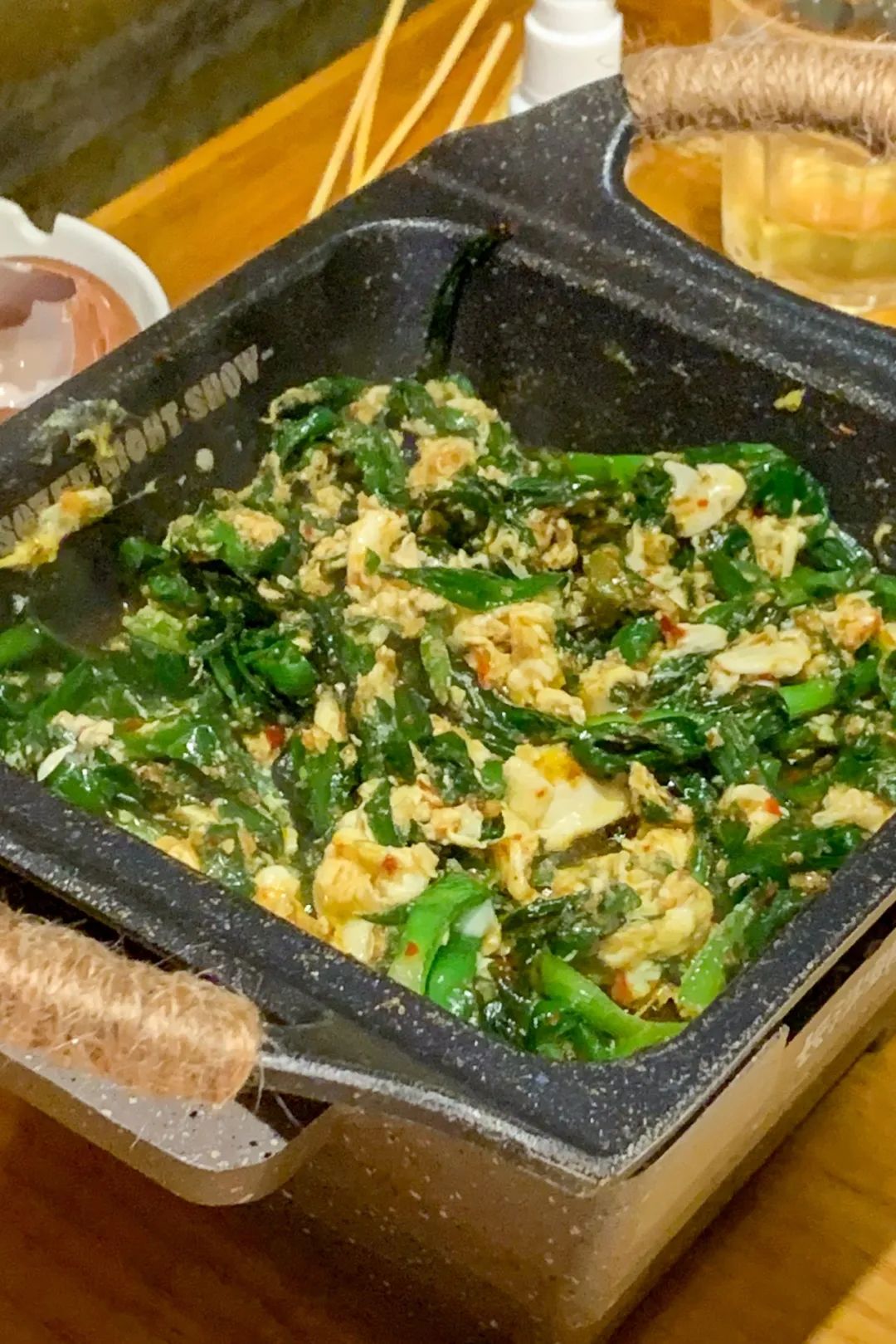 铁板烤韭菜鸡蛋则是岳阳烧烤的另一代表。在铁板上,来个“怡宝”瓶油壶滋上油,食客要亲自动手放韭菜、打鸡蛋,金黄的蛋液裹着上了调料的韭菜,清香宜人、滑嫩可口,真不愧为这肉食江湖中最受欢迎的素菜。