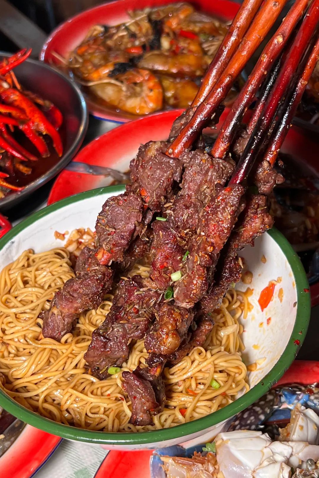 湘西小串按手卖,一手十几串,两手一起撸,一撸200串还不过瘾。明星单品烈火牛肉,切取最嫩的里脊部位,用数十种香料进行腌制,烤制后香嫩爽滑。