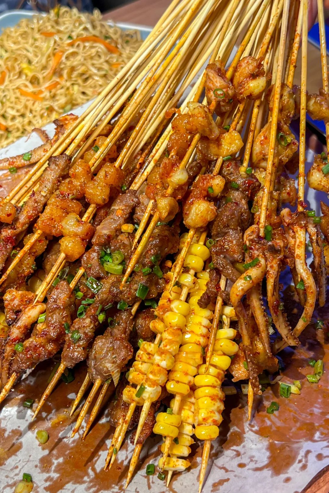 一边是因袭新疆传统的岳阳烧烤,分量十足的烤羊腿羊排羊蝎子,甚至还有红柳枝大块羊肉串;另一边则是小巧玲珑的湘西小串,牛油黄喉掌中宝一口一串,迷你风格独步湖湘。