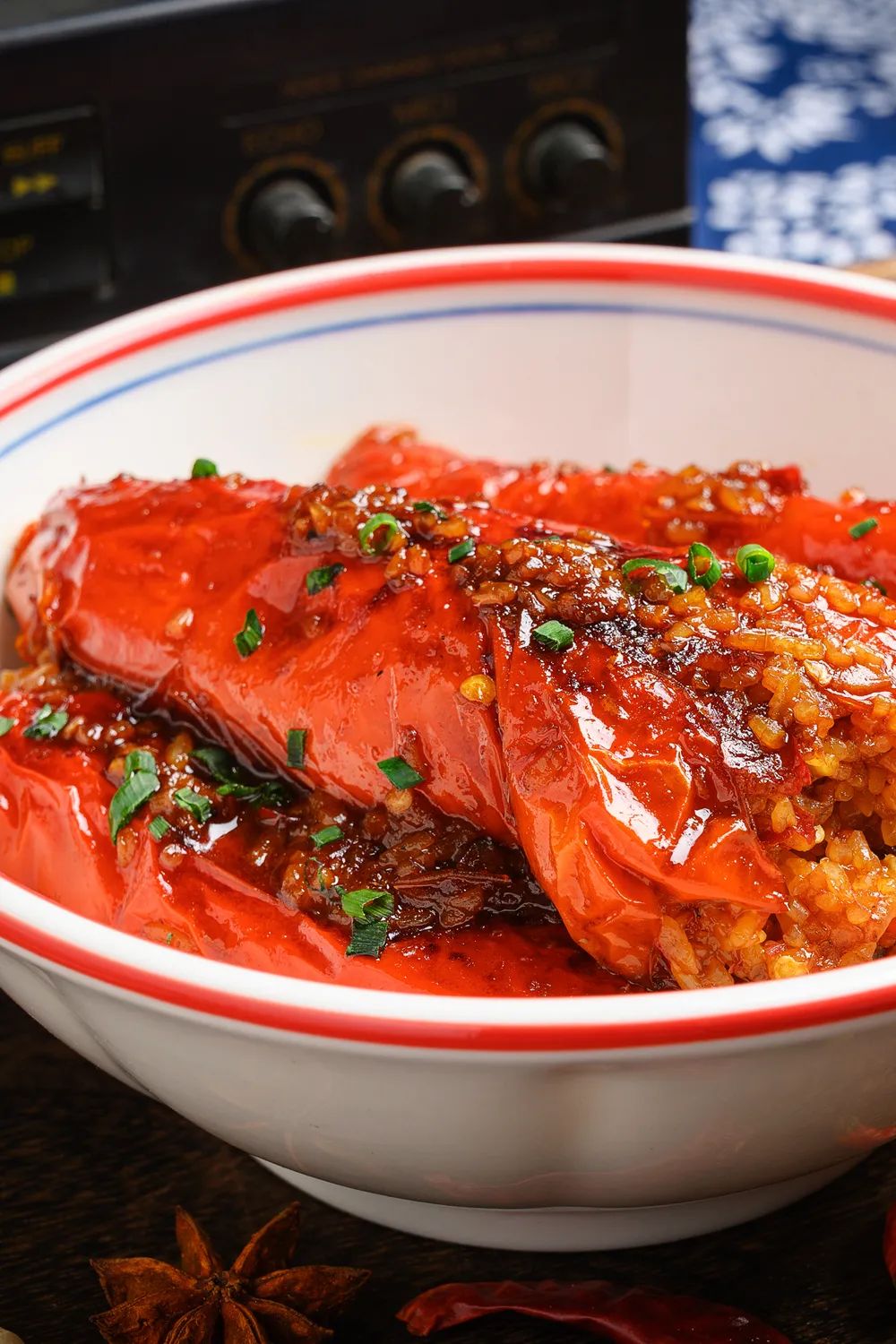 而所有能“炊”出来的菜肴里,其中最惊艳的,当属一道“炊辣椒包”。辣椒要选皮硬肉厚、刚好红透的,剖开去籽,刷一层油,再填入虾米、南瓜、火腿等与米粉一同做馅,再用本地的“强盗草”(学名:蛇含委陵菜)、紫苏、藠头调味。蒸出来的辣椒包红亮晶莹,光从外形上看就让人食欲大开,入口更是脆辣干香,吃得满头大汗。