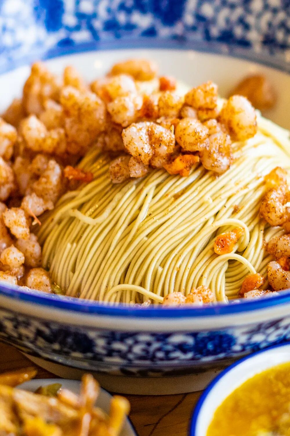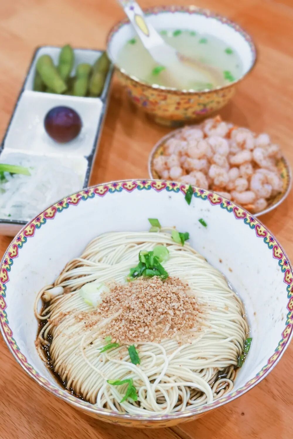 做三虾面,是一门手艺活儿。吃三虾面,更是如此。快速把面条翻拌均匀后倒入三虾浇头,尽量让每一根面条都裹上酱油和虾籽,再搭配上姜丝、炒青菜、炸黄豆、酸豇豆几碟小菜,翻拌均匀后“嗦”上一口。