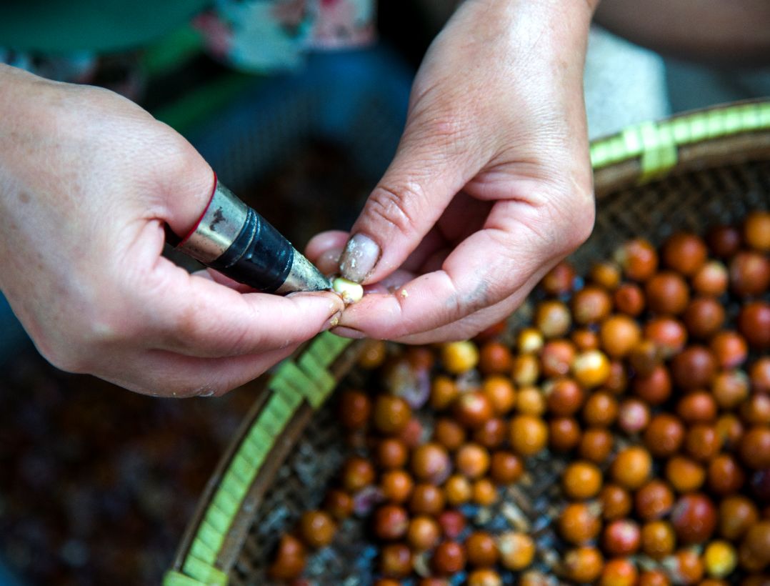 为迎接鸡头米的本尊,真可谓是“粒粒皆辛苦”。农户们打开它形似鸡喙的花萼,再拿剪刀与特制的指套一点点除去外皮,就如剖蚌得珠,要万分小心,才能得到一颗水灵滑润的种仁。