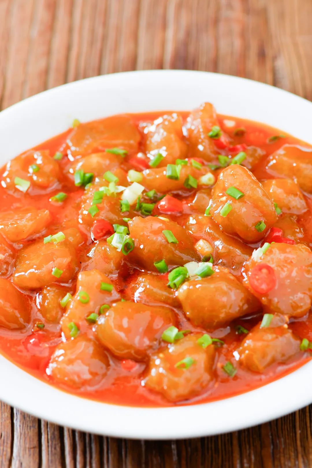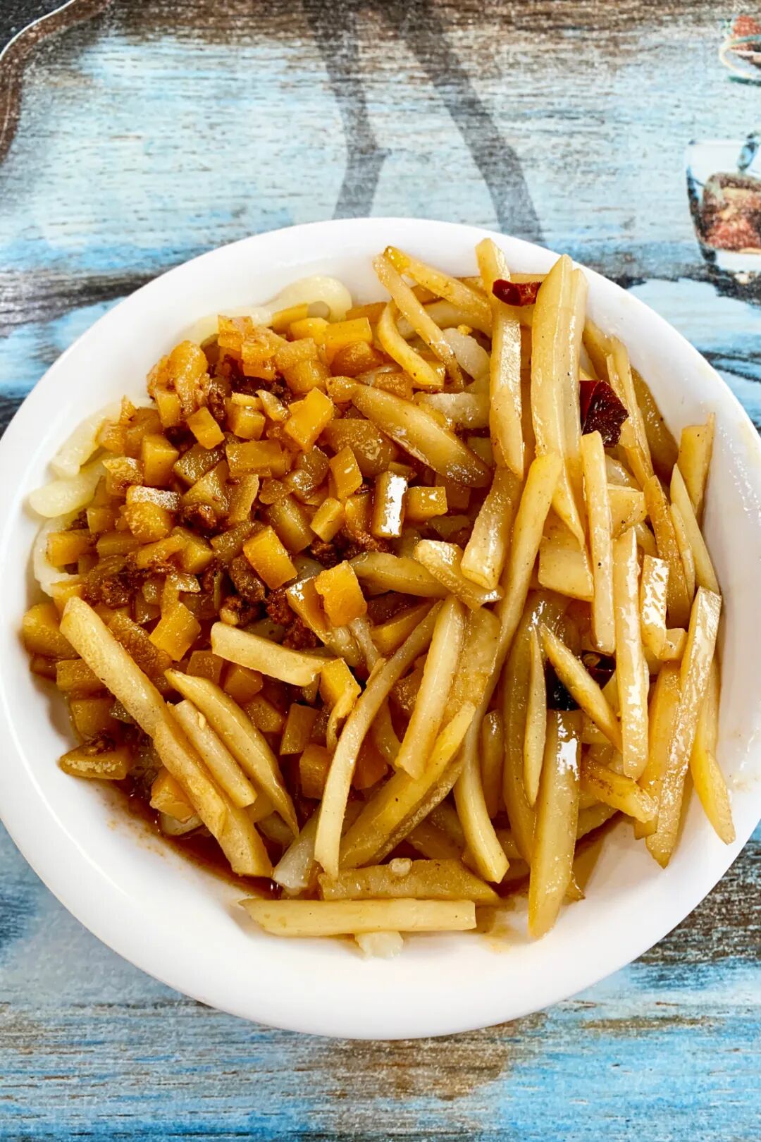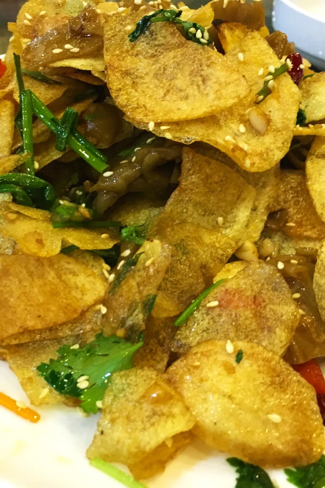 一道过油肉,在山西大同是“八大件”的固定成员。过油简直是一场温柔的冒险,与爆裂的油炸完全不同,过油需要让食材优雅地游走在60℃到70℃的油温之间,保持食材软嫩爽口。这种思路被运用到土豆中,就有了过油土豆。土豆先过油后爆炒,点到为止的勾芡,为土豆刷上了亮色。最后,山西老陈醋一滴入魂,用醇厚的酸香收尾。