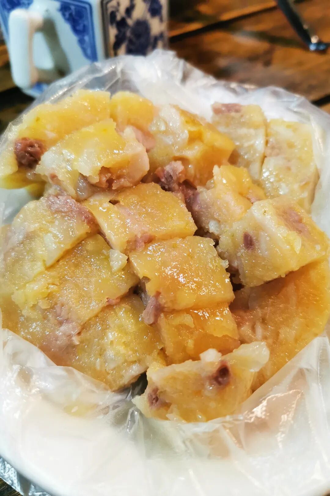 捣馕糕是土豆泥的极限拉扯,靠的是手速,要打出一种绵密、柔软的感觉。出锅后的土豆用棒槌捣烂,捣出“jianjian”的状态,捣到有拉丝效果。山西人的手,在这一刻不是压面机,而是捣泥器。