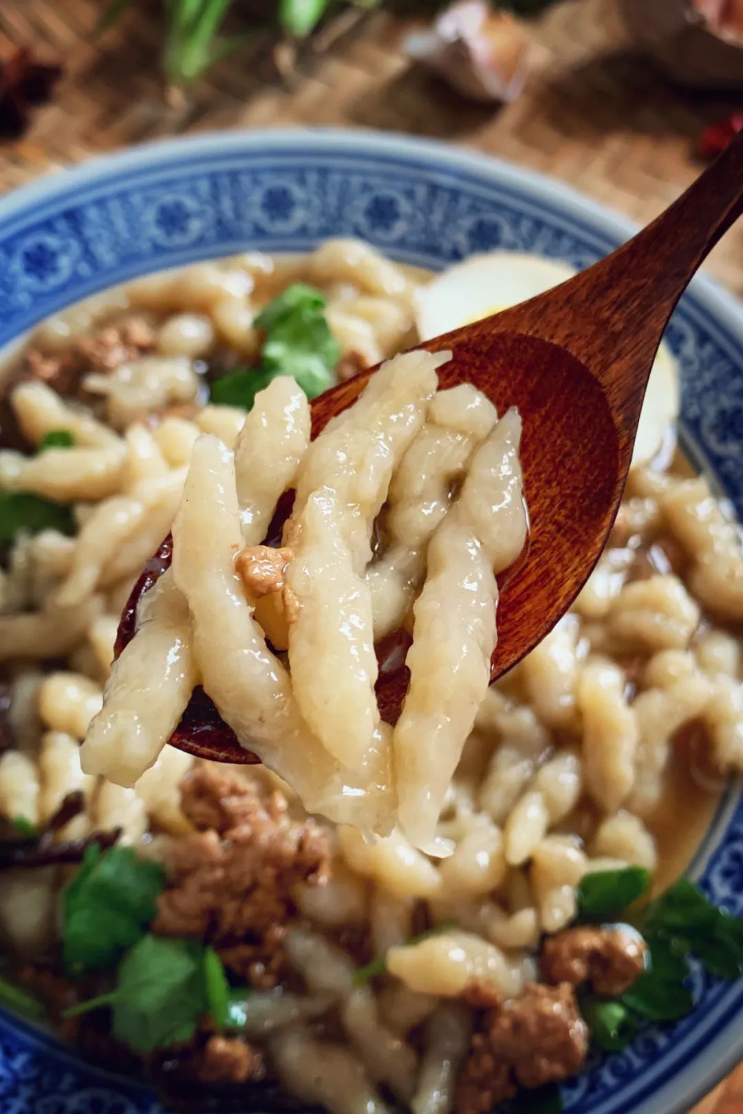 山西人将莜面和土豆搓成两头尖、中间圆鼓鼓的小鱼样,就变成了山药面鱼鱼。“搓”只是一个概述,还暗含着扯、夹、揪、压等手上的技法,每个山西人似乎都懂得搓鱼鱼的手艺之道,神奇的在厨房中变着土豆魔法。