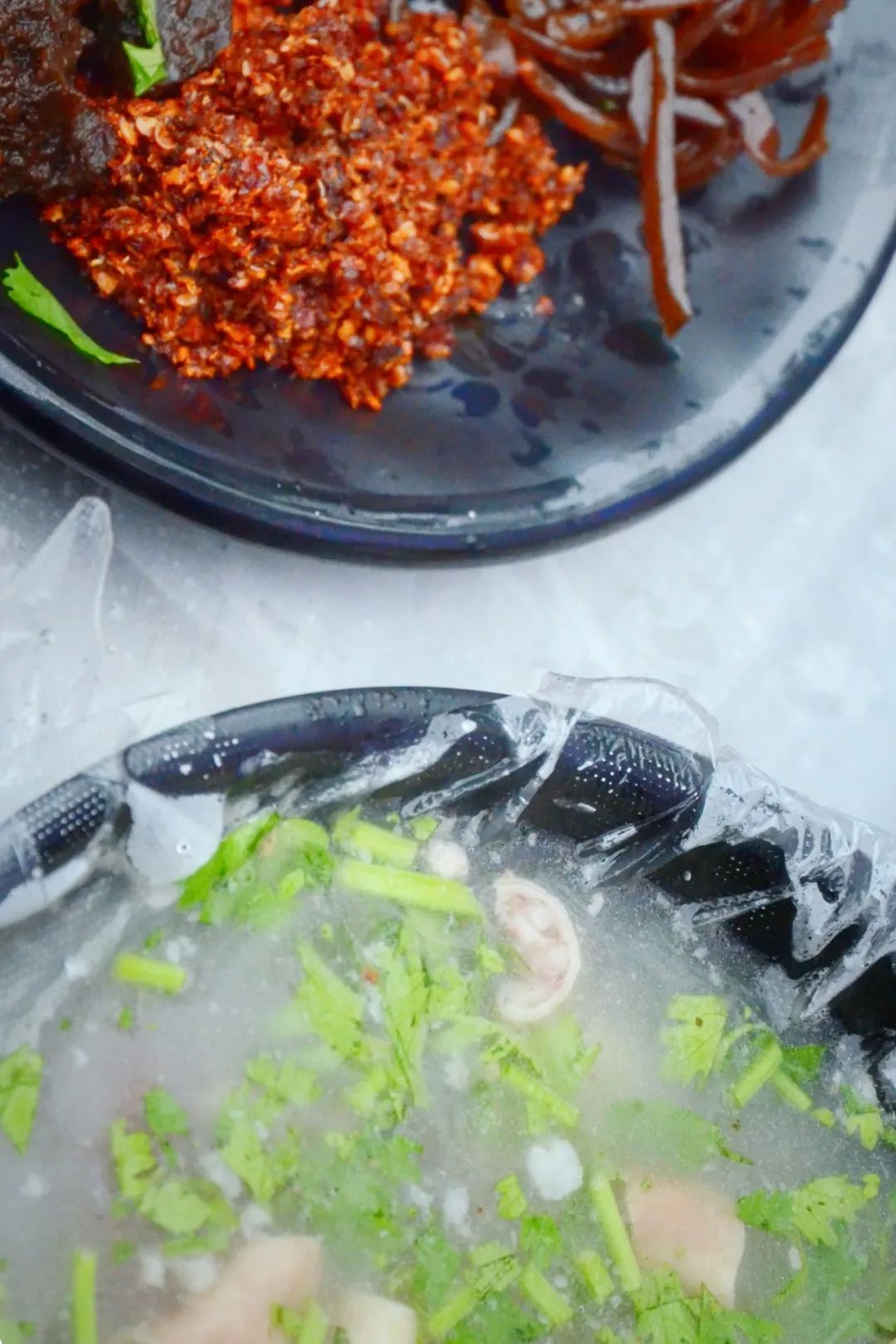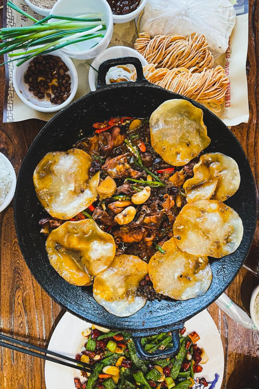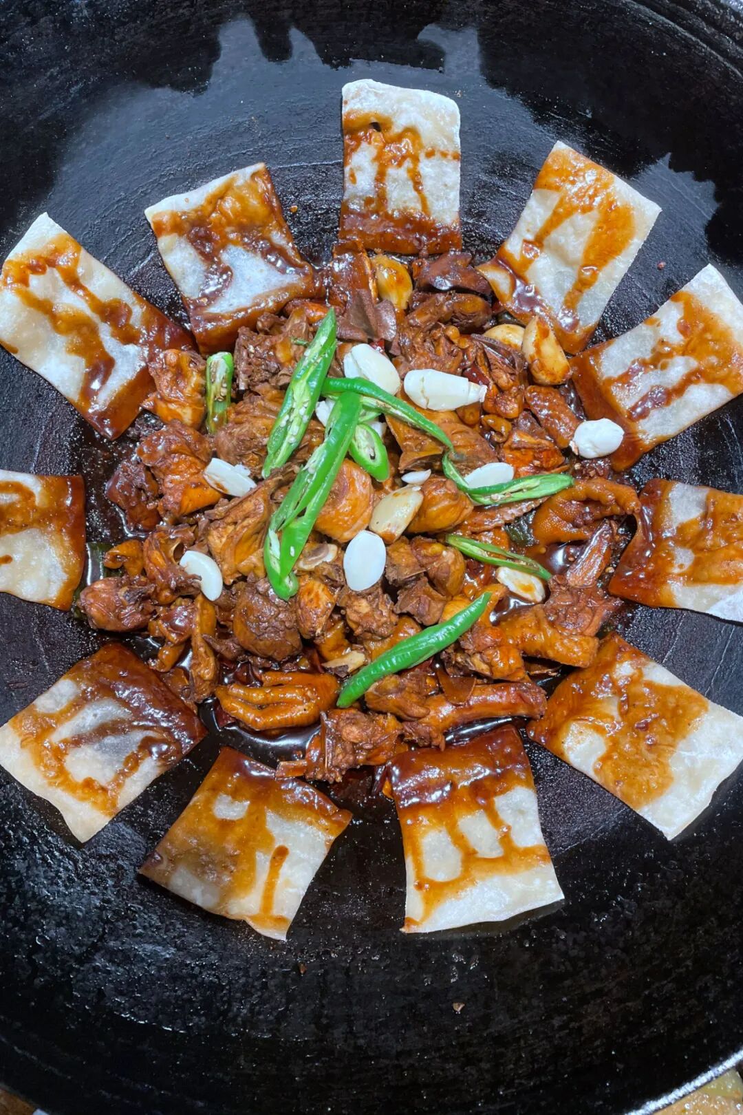 看似朴实的地锅鸡是“口渴神器”,小干鱼炒辣椒卷着烙馍也针扎似的辣,就连凉粉“蛙鱼”都免不了辣椒油。