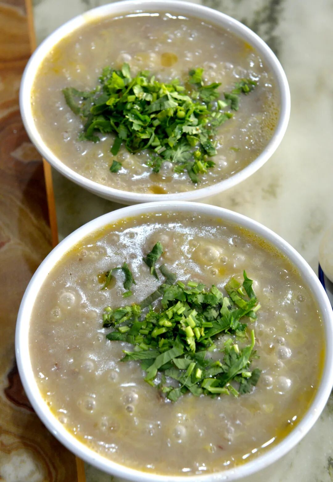 大锅直径约一米,只用洗净的羊肉、羊杂和羊骨头一起熬煮至奶白,不另加配菜,是纯粹的羊肉汤。当食客光顾,师傅在小碗里放一把羊肉或羊杂,然后用大勺在碗内盛满羊汤,一碗香喷喷的羊汤就好了。