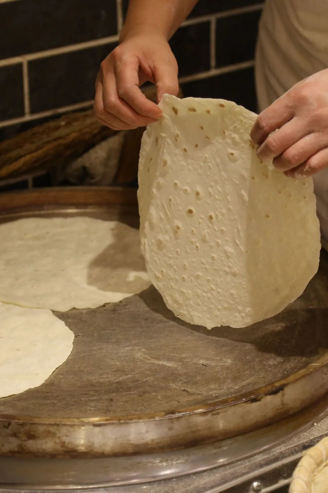 烙馍必须用铁鏊子烙。将面团擀成薄薄的圆形面皮,放在鏊子上,煤炭火烧,待到飘出面香即可。这样烙出来的烙馍,表面有一层细细的面粉,举在太阳下会透光,口感柔软有韧劲。