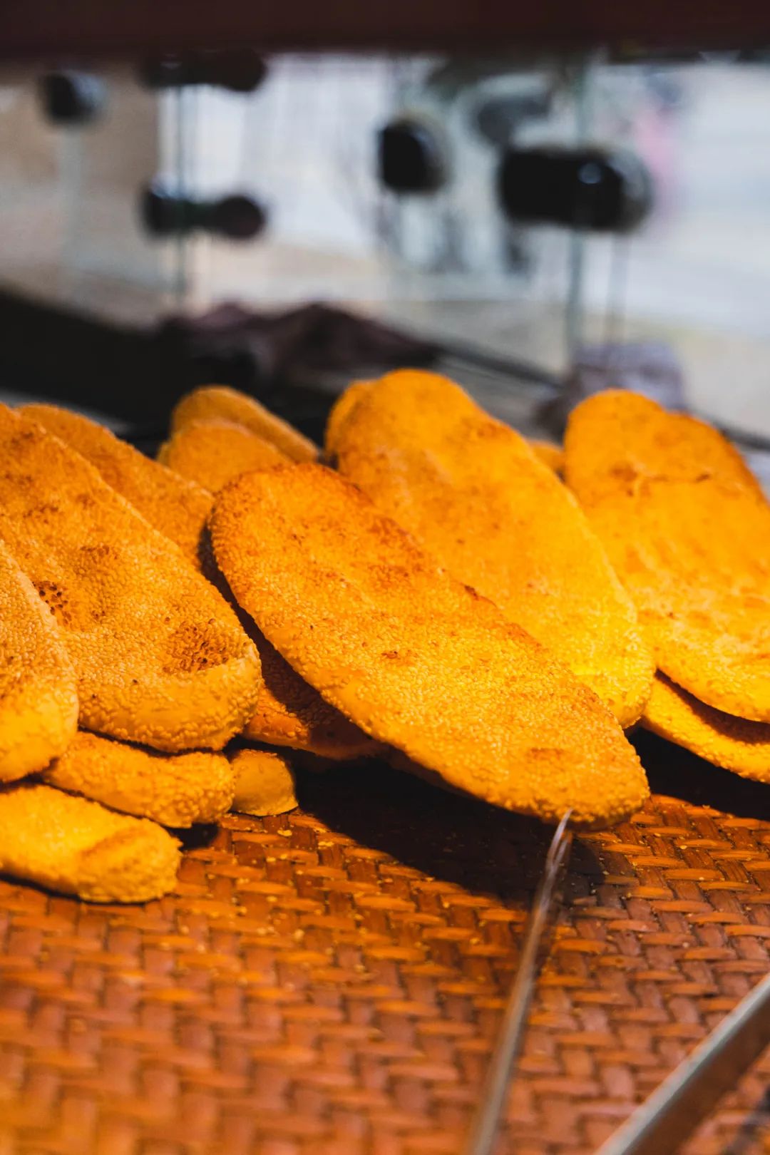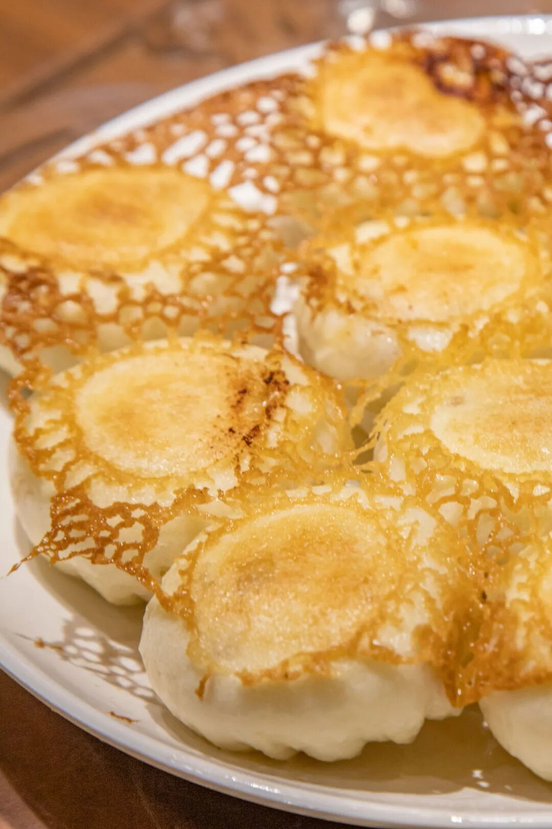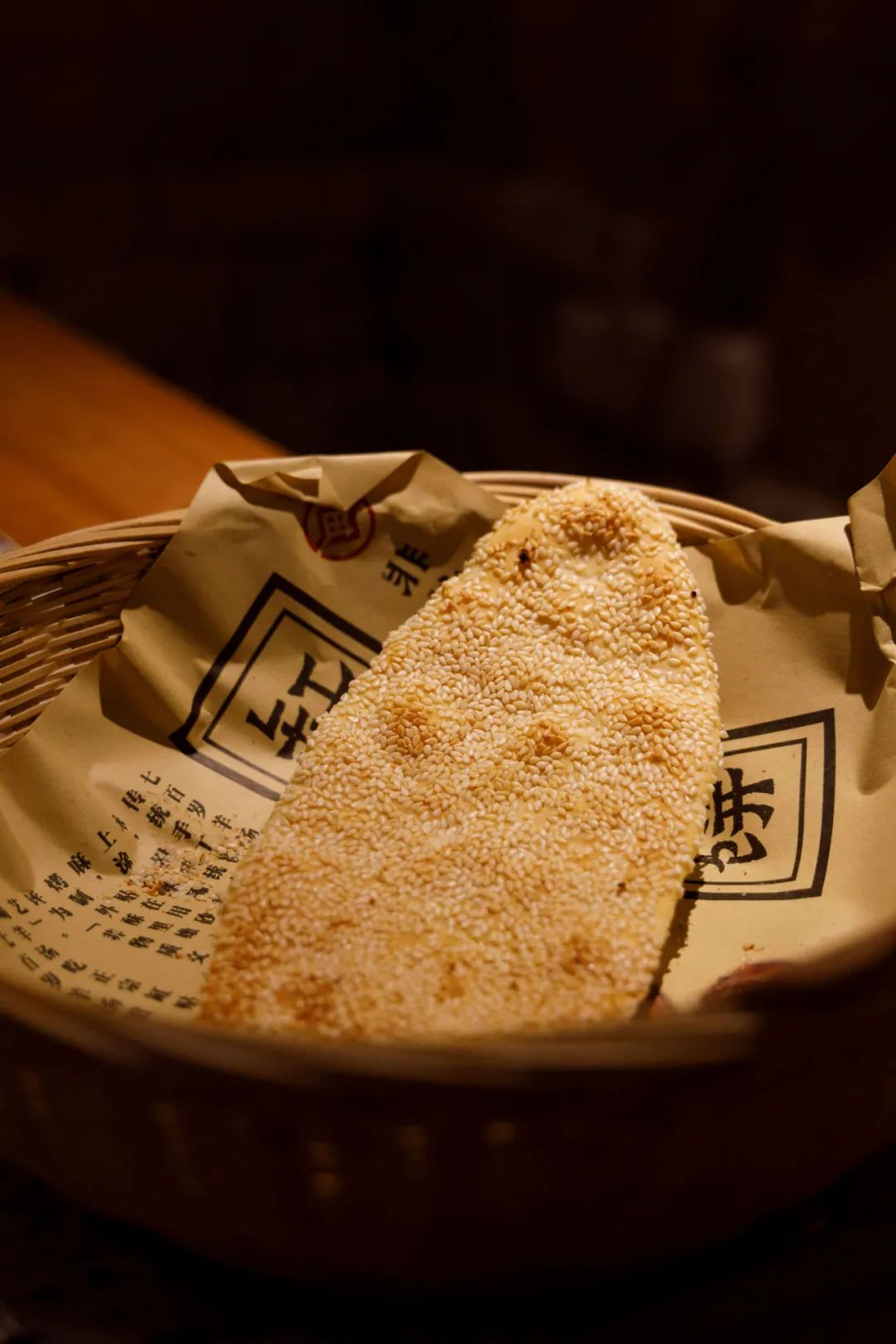 缸贴子烧饼,要用老面头发酵的面饼,在上面涂一层糖稀和蜂蜜,洒满芝麻,然后贴在用砂缸特制的炉子内壁烤啊烤。新出炉的烧饼外酥里软,芝麻的香气和面香融在一起,后味里还有淡淡的甜,空口吃也好吃。