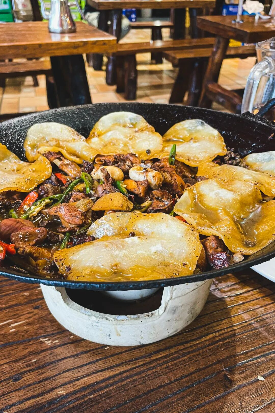 鸡肉口感干香,鲜辣可口;焖熟的面饼,吸收了满满的鸡肉香气,嚼着竟有肉感,再用面饼蘸一下浓郁的汤汁,那香气真是妙不可言,难怪总有人说地锅鸡的饼比肉还好吃。一群好友围着地锅鸡,就着小酒,就要吃他个大汗淋漓、热火朝天。