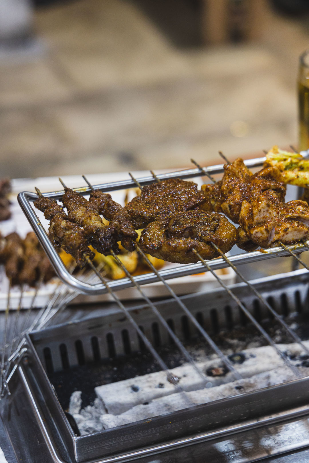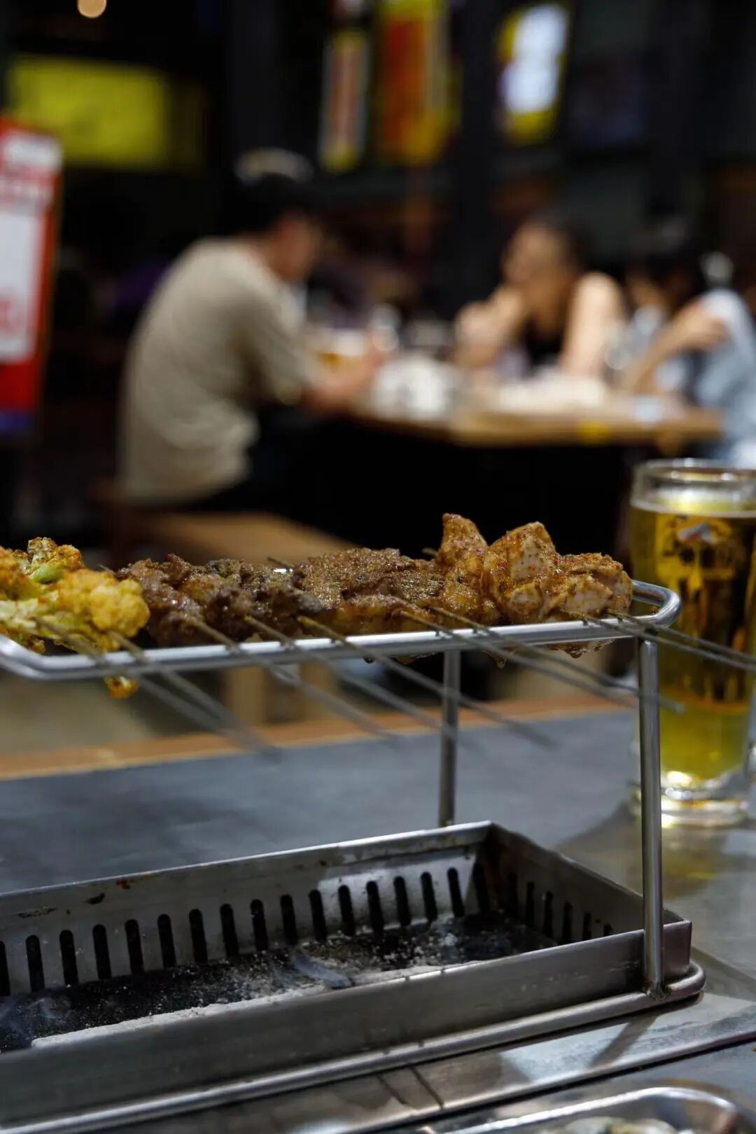 徐州烧烤店都会在桌子上另外放置小炭炉,师傅烤到六七成熟,接下来就由食客凭喜好自己完成烤制。徐州人讲究“老球嫩腰”,羊球要大火旺烤,烤老一点;油腰子则一定要嫩烤,最好留有一些血丝,才能有最佳口感。