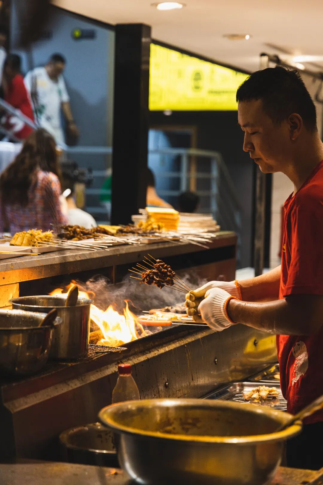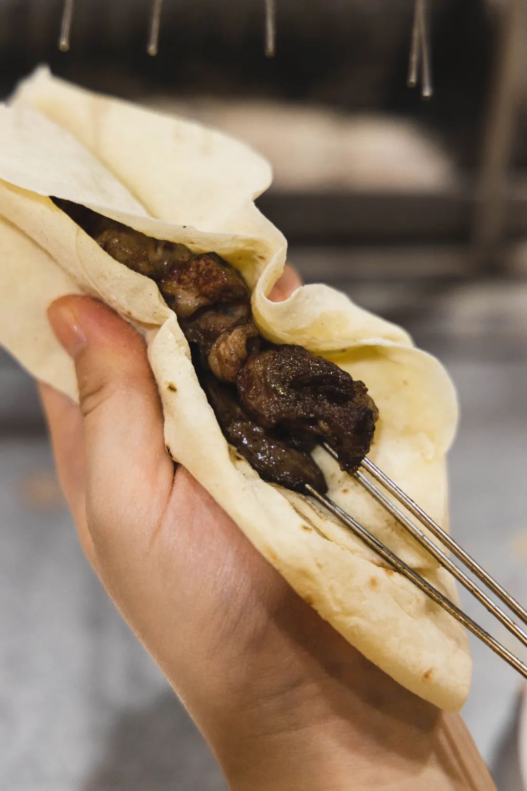 烤过的羊球,口感稠密,风味独特;烤油腰子夹在烙馍里,肥而不腻,香气瞬间充盈口腔。蔬菜则烤得干干的,口感微脆,很好地中和了烤肉的油腻。